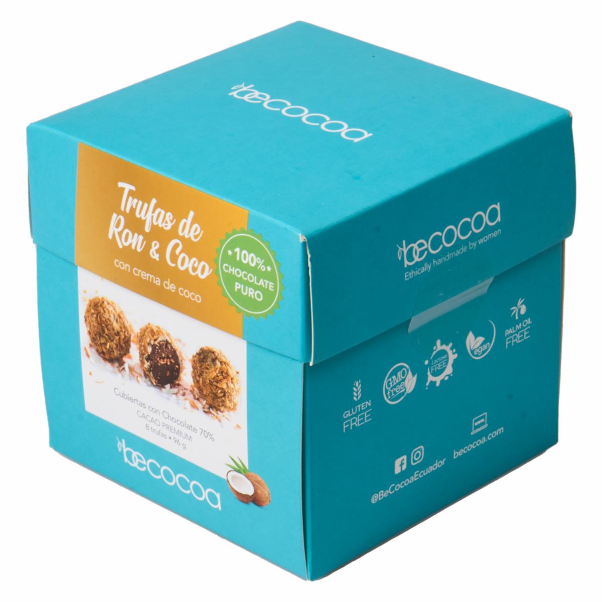 - Las Trufas de Ron con Crema de Coco BE COCOA 96 G son un dulce artesanal que combina la suavidad del chocolate con el toque exótico del ron y la cremosidad del coco. Estas trufas están elaboradas con ingredientes de alta calidad, ofreciendo una experiencia gourmet en cada bocado. Su presentación en caja de 96 gramos las hace ideales para regalar o disfrutar en momentos especiales