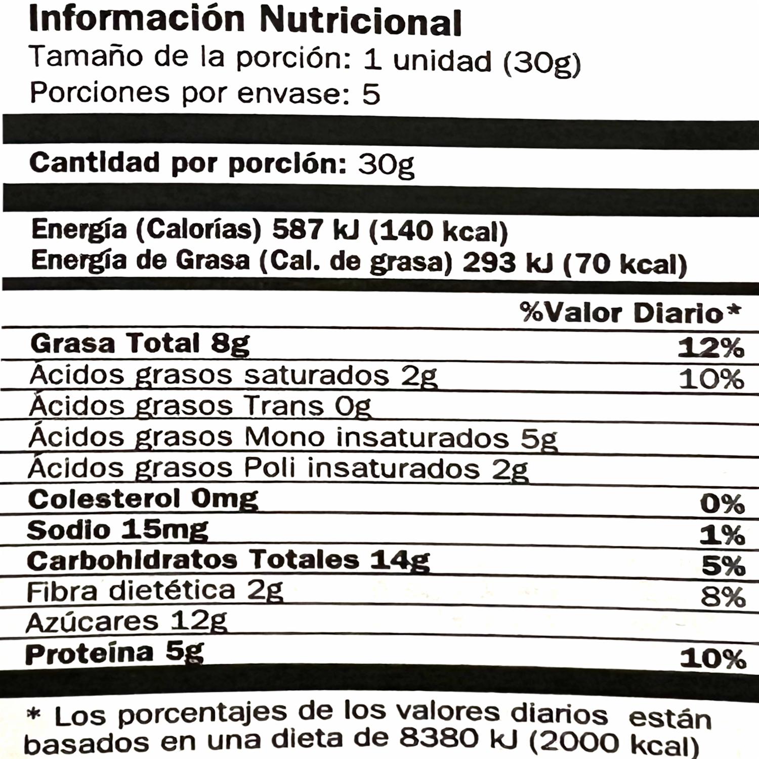- Información Nutricional (por 100g): Valor energético: 1994kJ / 477kcal Grasas: 26g De las cuales Ácidos grasos saturados: 4,6g Hidratos de carbono: 46g De los cuales Azúcares: 39g Proteínas: 15g Sal: 0.05g