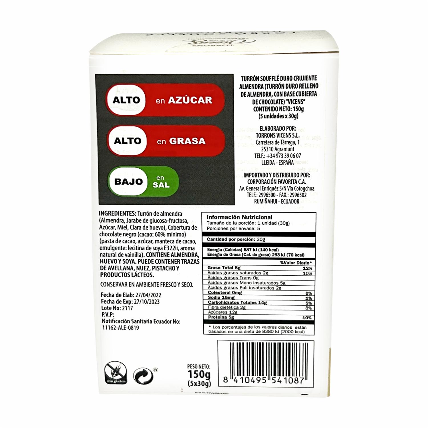 - Ingredientes: Turrón de almendra (91%) (almendra (56%), jarabe de glucosa-fructosa, azúcar, miel, clara de huevo). Cobertura de chocolate negro (cacao: 60% mín.) (9%) (pasta de cacao, azúcar, manteca de cacao, emulgente: lecitina de soja, aroma natural de vainilla). No contiene gluten. Puede contener trazas de otros frutos de cáscara y productos lácteos