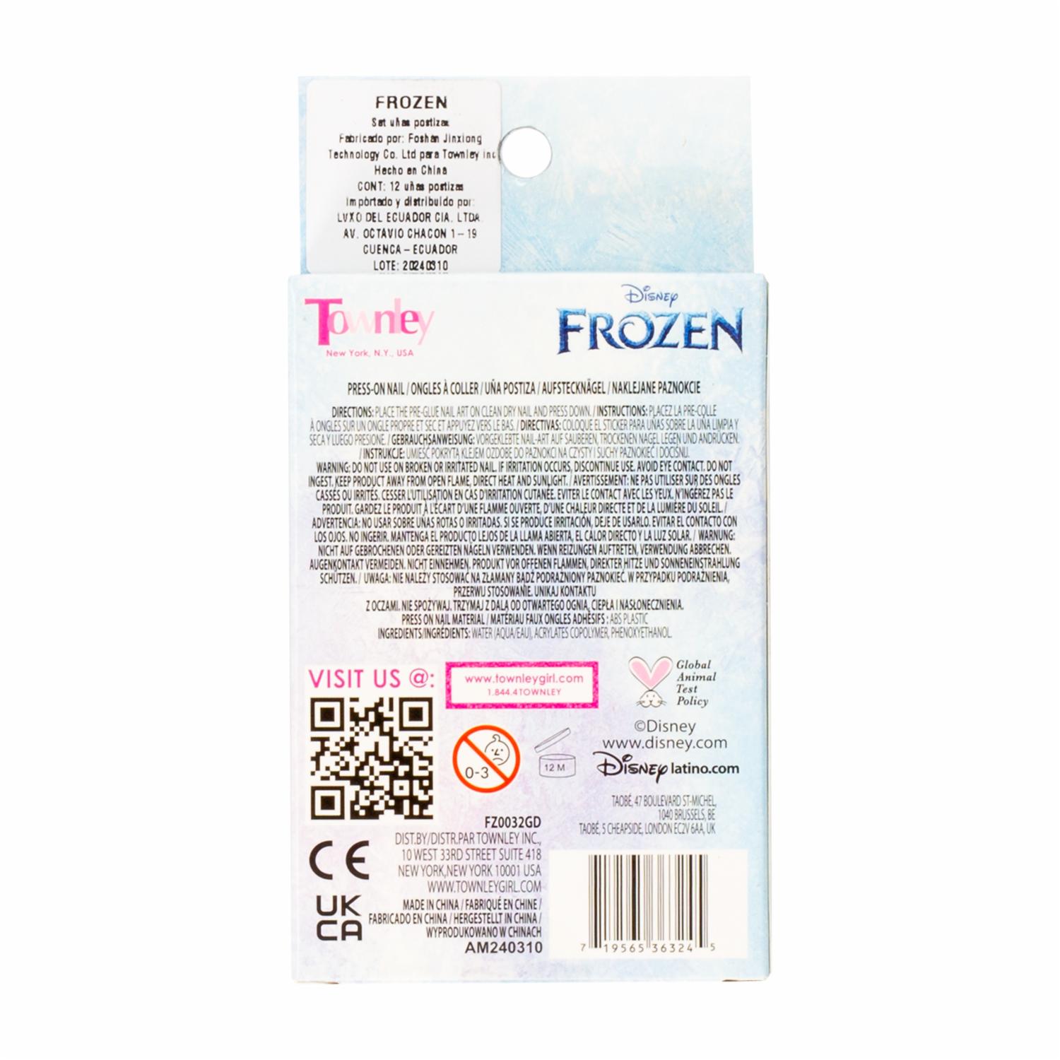 - Las uñas postizas para niña Frozen de Townley Girl son un producto diseñado para decorar y embellecer las uñas de las niñasEstas uñas postizas están inspiradas en el popular personaje de la película Frozen de Disney y tienen una variedad de diseños y colores divertidos y atractivos para las niñasSon fáciles de aplicar y se pueden quitar fácilmente sin dañar las uñas naturalesSon ideales para fiestas de cumpleaños, disfraces o simplemente para jugar y divertirse