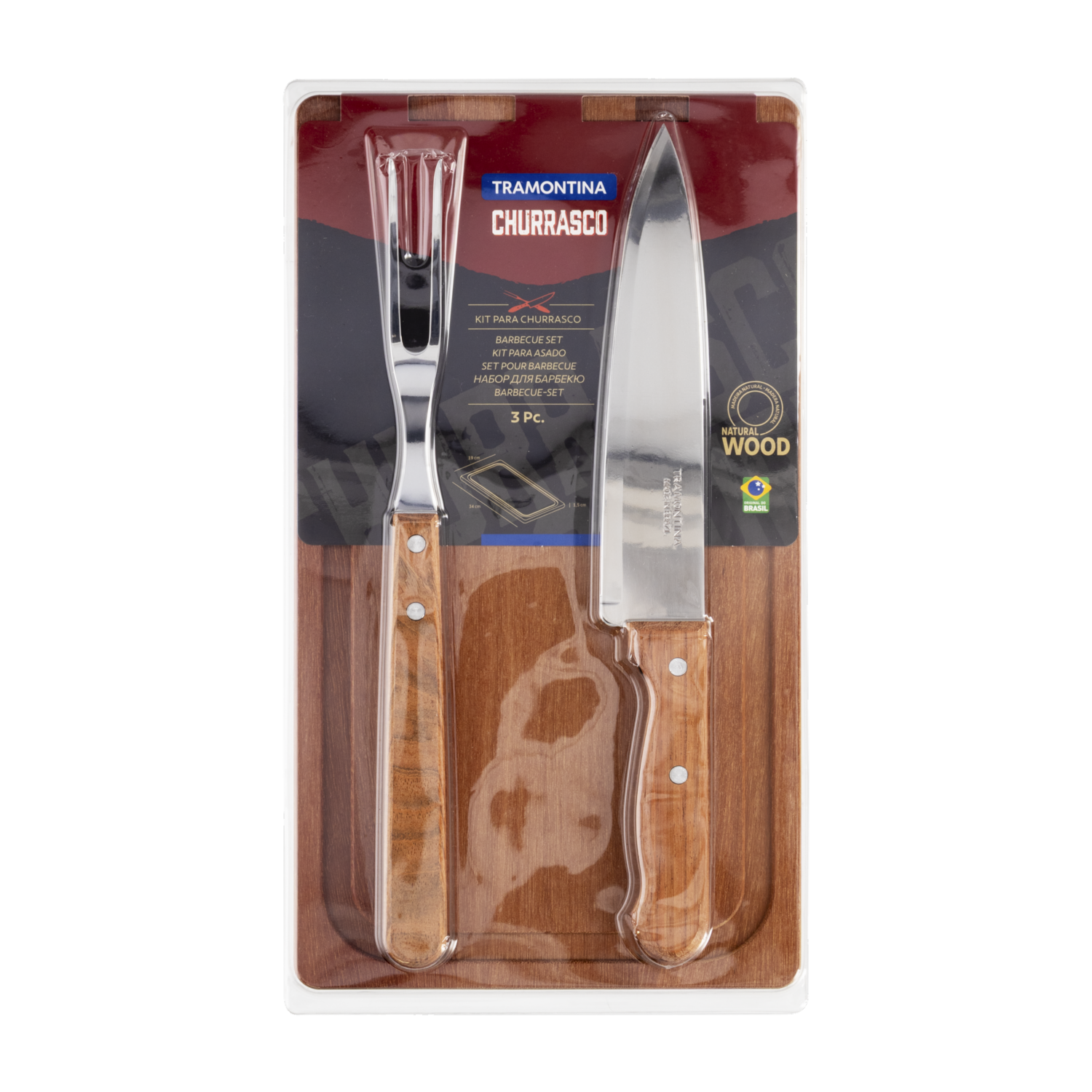 - El kit de utensilios para barbacoa churrasco Tramontina (x3 unidades) incluye una tabla de picar, un cuchillo y un trinche, todos diseñados para ofrecerte la mejor experiencia al preparar tus parrilladas