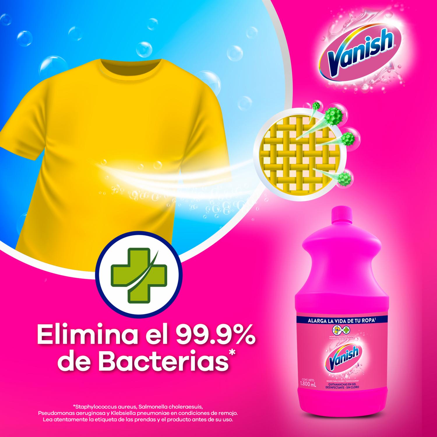 - Vanish Líquido Es Un Quitamanchas Sin Cloro Que Elimina Las Manchas Más Difíciles De Tus Prendas. Ahora Con Su Fórmula Mejorada También Elimina Hasta El 99.9% De Bacterias. Lea Atentamente El Rótulo / Etiqueta De Las Prendas Y El Producto Antes De Su Uso