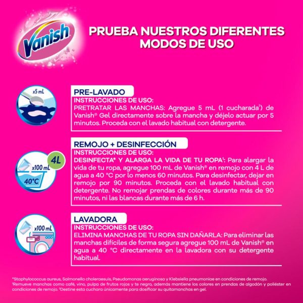 Vanish Líquido Es Un Quitamanchas Sin Cloro Que Elimina Las Manchas Más Difíciles De Tus Prendas. Ahora Con Su Fórmula Mejorada También Elimina Hasta El 99.9% De Bacterias. Lea Atentamente El Rótulo / Etiqueta De Las Prendas Y El Producto Antes De Su Uso