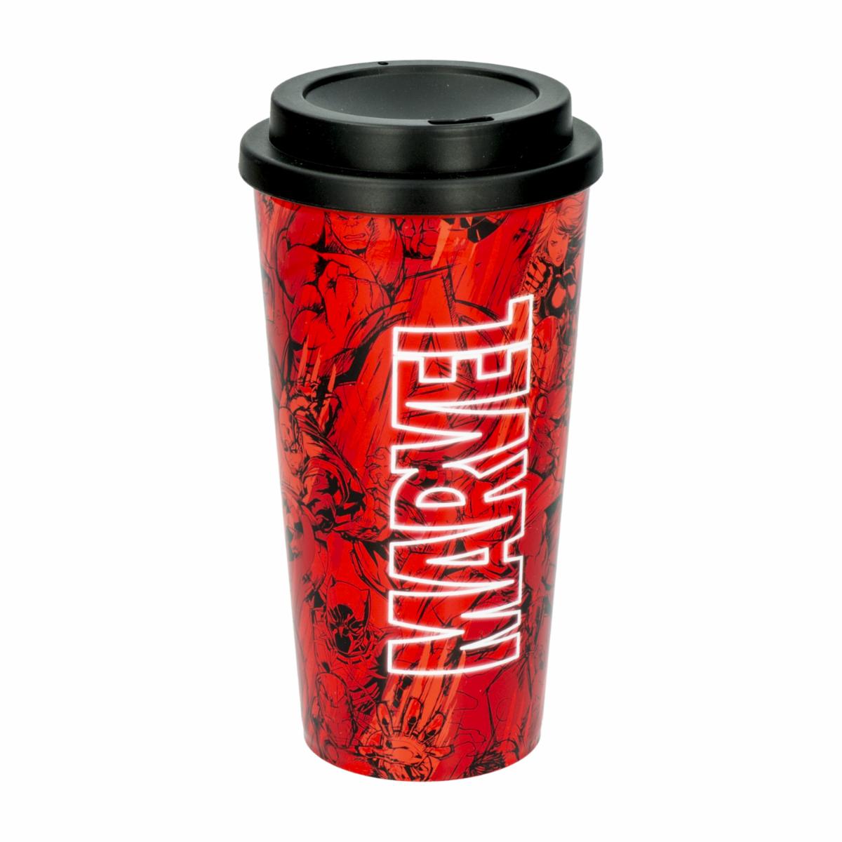 - Vaso plástico con tapa y diseño exclusivo de Marvel. Perfecto para bebidas frías, práctico y divertido para los fanáticos de los superhéroes.