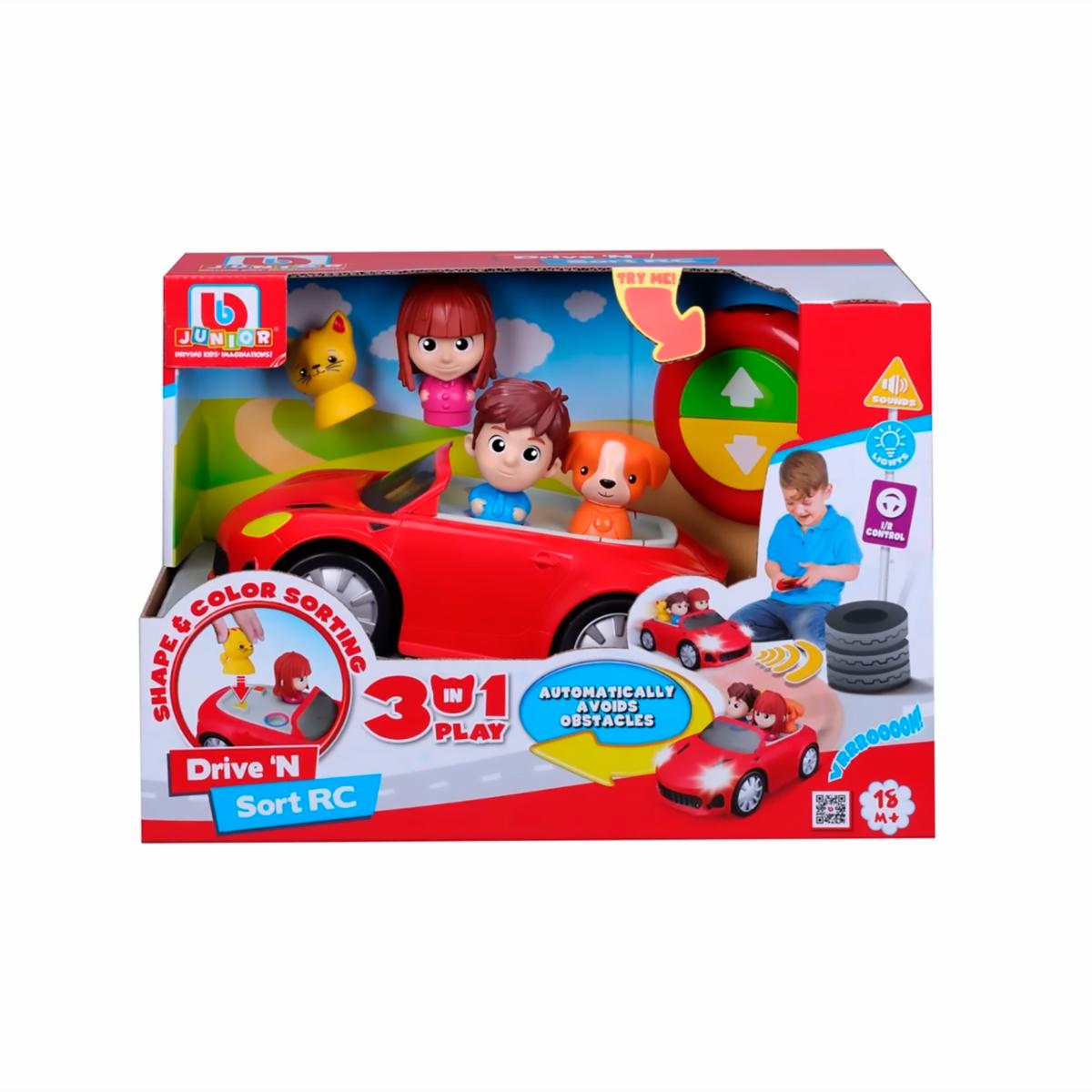 - El Drive N Sort RC de BBJunior combina aprendizaje y diversión en un auto interactivo 3 en 1 que permite clasificar formas y colores, conducir en modo control remoto o dejarlo avanzar esquivando obstáculos de forma automática; con sonidos, luces y actividades didácticas, estimula la coordinación, la lógica y la curiosidad motriz desde temprana edad de manera segura y entretenida. ¡Aprende, conduce y juega sin parar con BBJunior en Juguetón, donde cada recorrido despierta diversión inteligente!