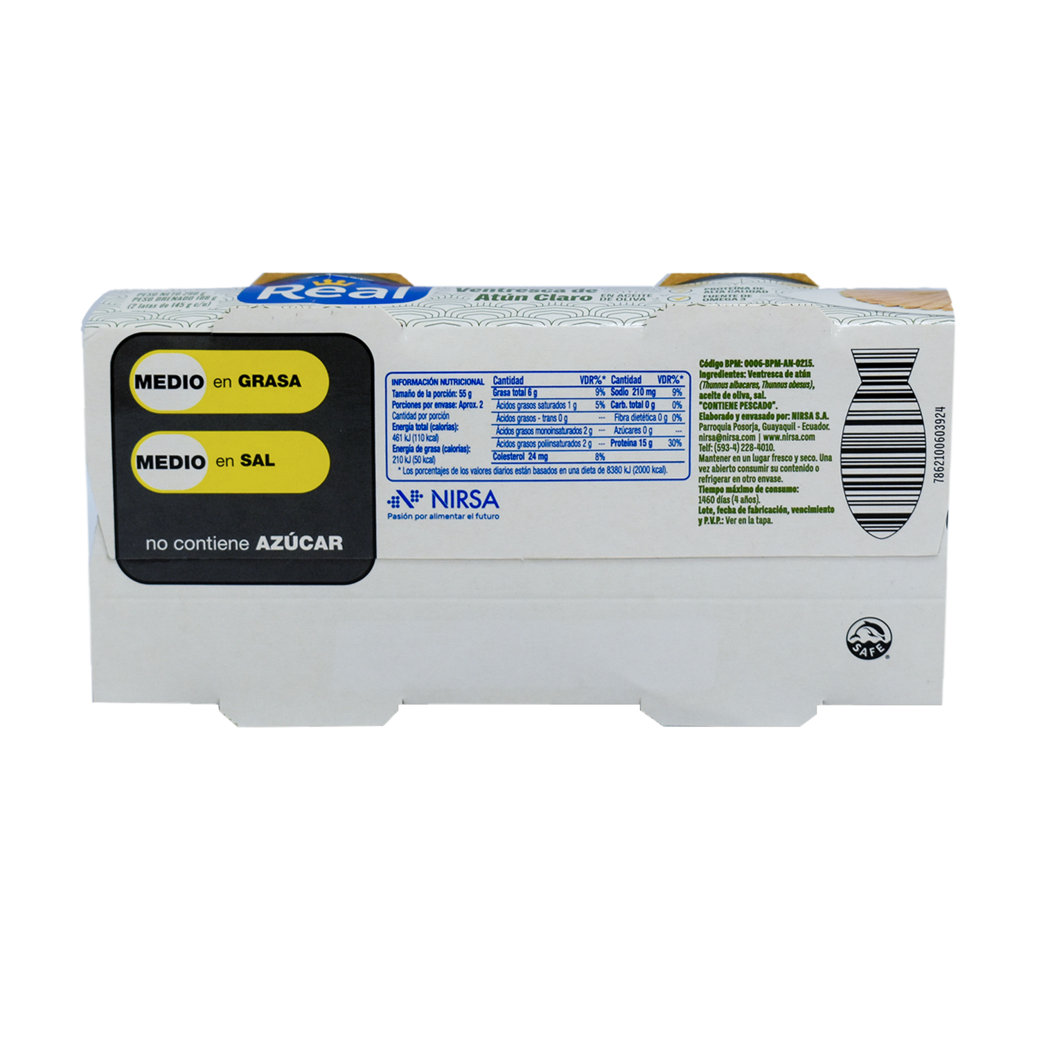 consultando preciosVentresca De Atún Claro En Aceite De Oliva REAL 2 X 145 G – REAL. Disponible en nuestros locales. Precio y stock pueden variar según la tienda.