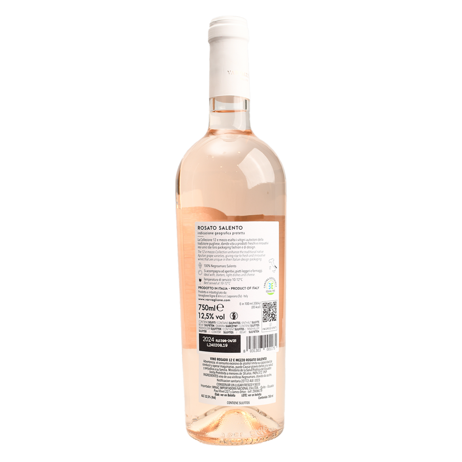 - Disfruta de la delicadeza y frescura del vino rosado Rosato Salento 12 e Mezzo VARVAGLIONE. Su sabor afrutado y equilibrado lo hace ideal para acompañar ensaladas, mariscos o momentos de relax. Cada copa ofrece una experiencia elegante y refrescante que convierte cualquier ocasión en especial