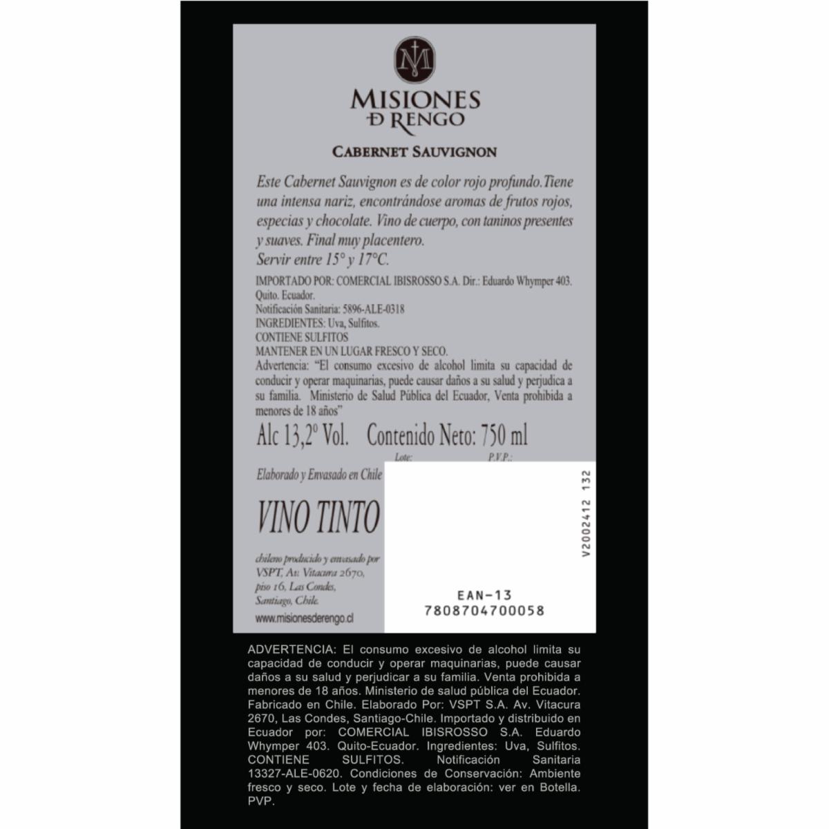 Vino Tinto Cabernet Sauvignon MISIONES D RENGO 750 ml – MISIONES D RENGO. Disponible en nuestros locales. Precio y stock pueden variar según la tienda.