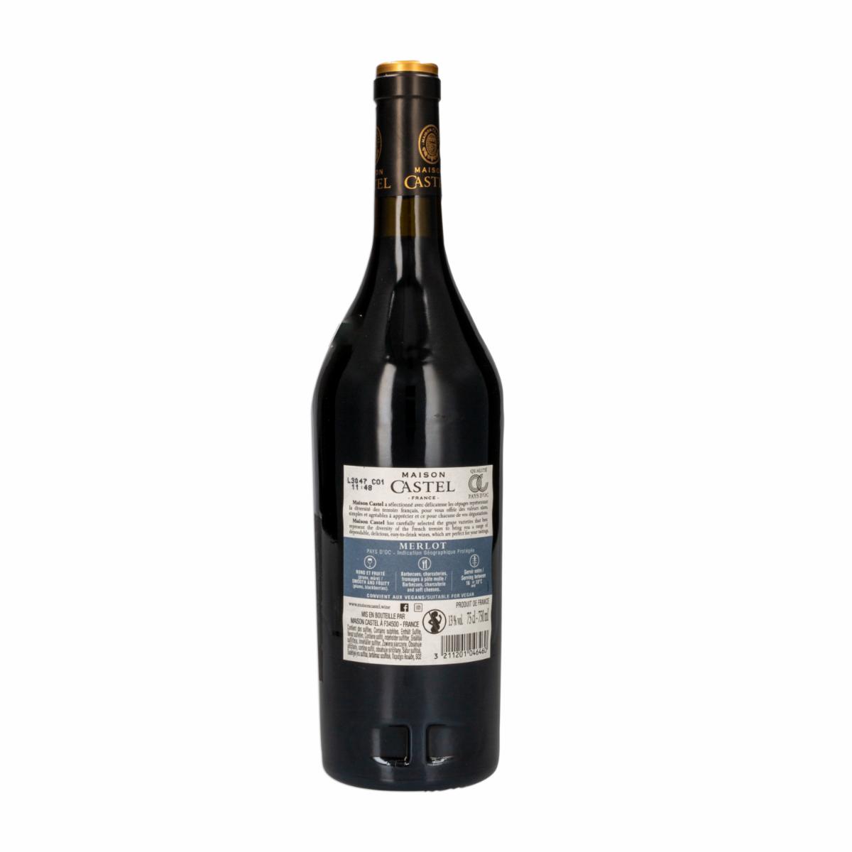 - - El vino tinto Merlot de Maison Castel es de alta calidad y se caracteriza por su sabor suave y redondo.,- Tiene un color rojo intenso y brillante, con aromas a frutas rojas maduras y notas especiadas.,- Es un vino equilibrado y fácil de beber, con taninos suaves y una acidez moderada.,- Combina bien con una variedad de platos, como carnes rojas, aves de corral y quesos suaves.,- Se recomienda servir a una temperatura de entre 16°C y 18°C para disfrutar al máximo de sus sabores y aromas