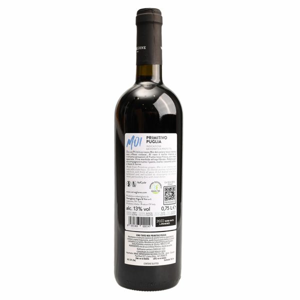 Descubre el carácter intenso y afrutado del vino tinto Primitivo Puglia Moi VARVAGLIONE. Perfecto para acompañar carnes, pastas o quesos curados, ofrece un sabor equilibrado y memorable. Cada copa transforma tus momentos en experiencias llenas de sofisticación y disfrute auténtico
