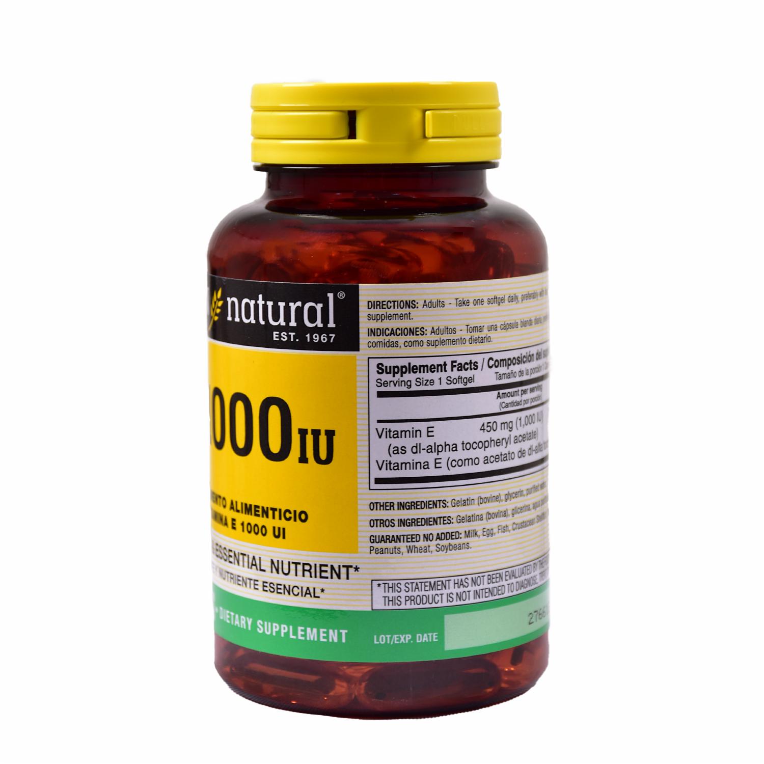 Vitamina E de 1000 UI, importada desde EE. UU. La vitamina E es esencial para mantener un sistema inmunológico fuerte, promover la salud de la piel, el cabello y las uñas, y contribuir a la prevención de enfermedades cardiovasculares. Cada frasco contiene 100 softgels. La dosis recomendada es una softgel al día
