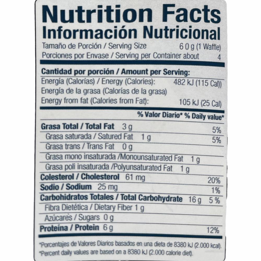 Waffles congelados, elaborados con harina de avena, bananos y arándanos frescos. Libres de azúcar y edulcorantes artificiales. Listos para meter al horno previamente precalentado a temperatura media durante 8-10 minutos