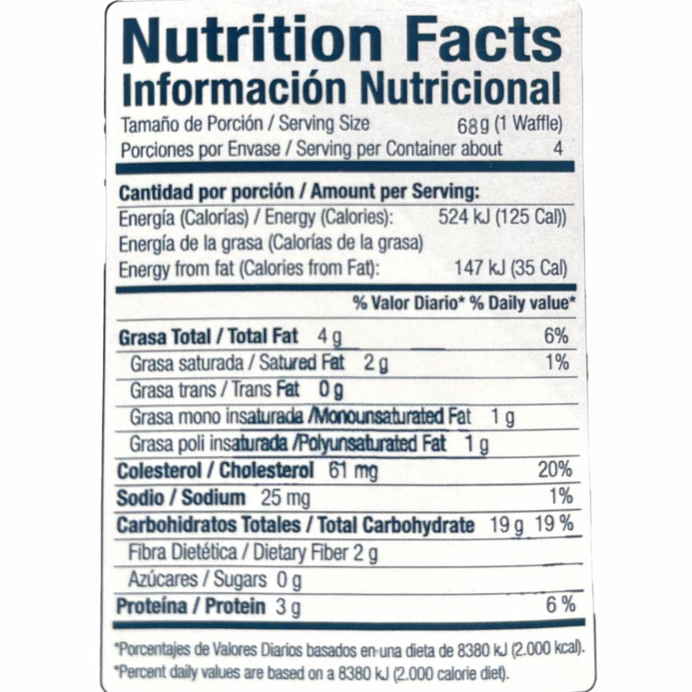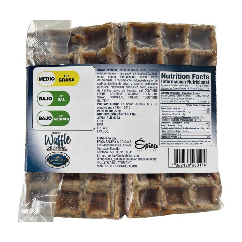 Waffles congelados, elaborados con harina de avena, bananos frescos y chispas de chocolate. Libres de azúcar y edulcorantes artificiales. Listos para meter al horno previamente precalentado a temperatura media durante 8-10 minutos