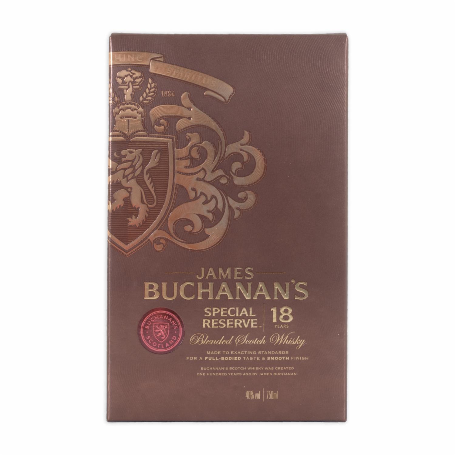 - Buchanans Scotch Whisky Reserve 18 Anos es un whisky de gran cuerpo, madurado en roble. Ofrece capas de malta, especias y frutas secas. Recomendado solo, con hielo o con un toque de agua