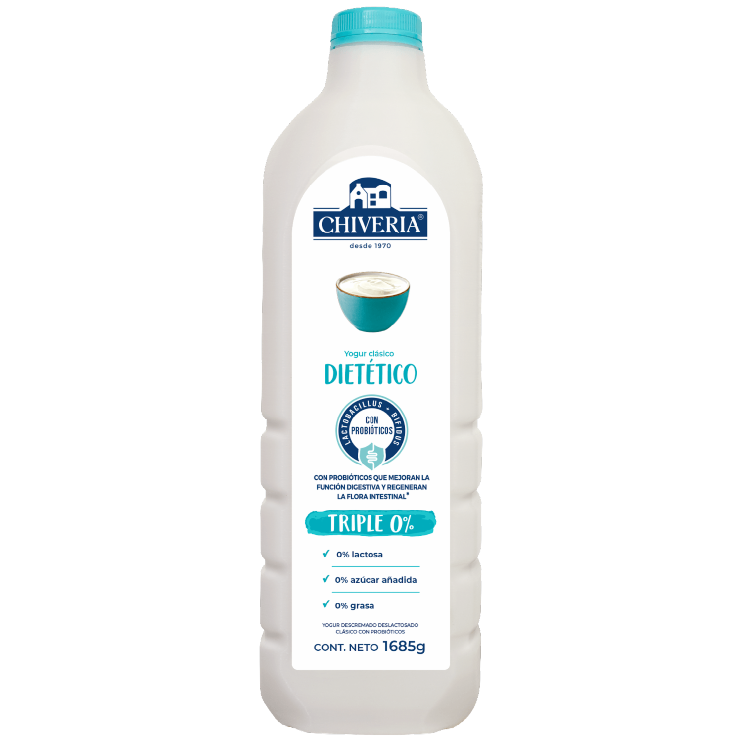 Yogur dietético CHIVERIA sin azúcar, libre de colorantes y saborizantes artificiales. Elaborado con yogurt descremado clásico con probióticos AB. Este producto contiene edulcorante no calórico