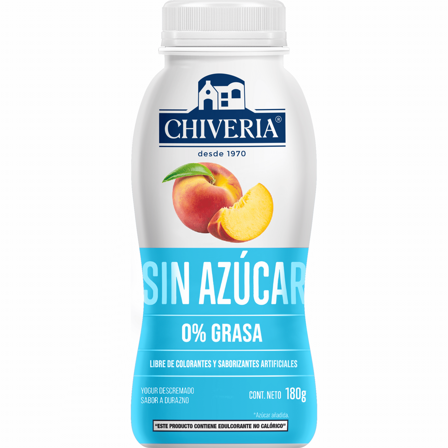 Yogur CHIVERIA sin azúcar, 0% grasa, libre de colorantes y saborizantes artificiales. Elaborado con yogurt descremado. Este producto contiene edulcorante no calórico