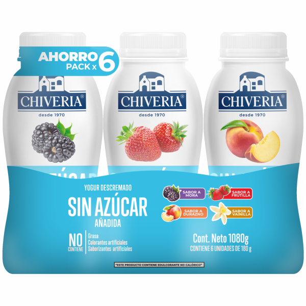 Pack de Yogur CHIVERIA sin azúcar, 0% grasa, libre de colorantes y saborizantes artificiales. Elaborado con yogurt descremado. Este producto contiene edulcorante no calórico
