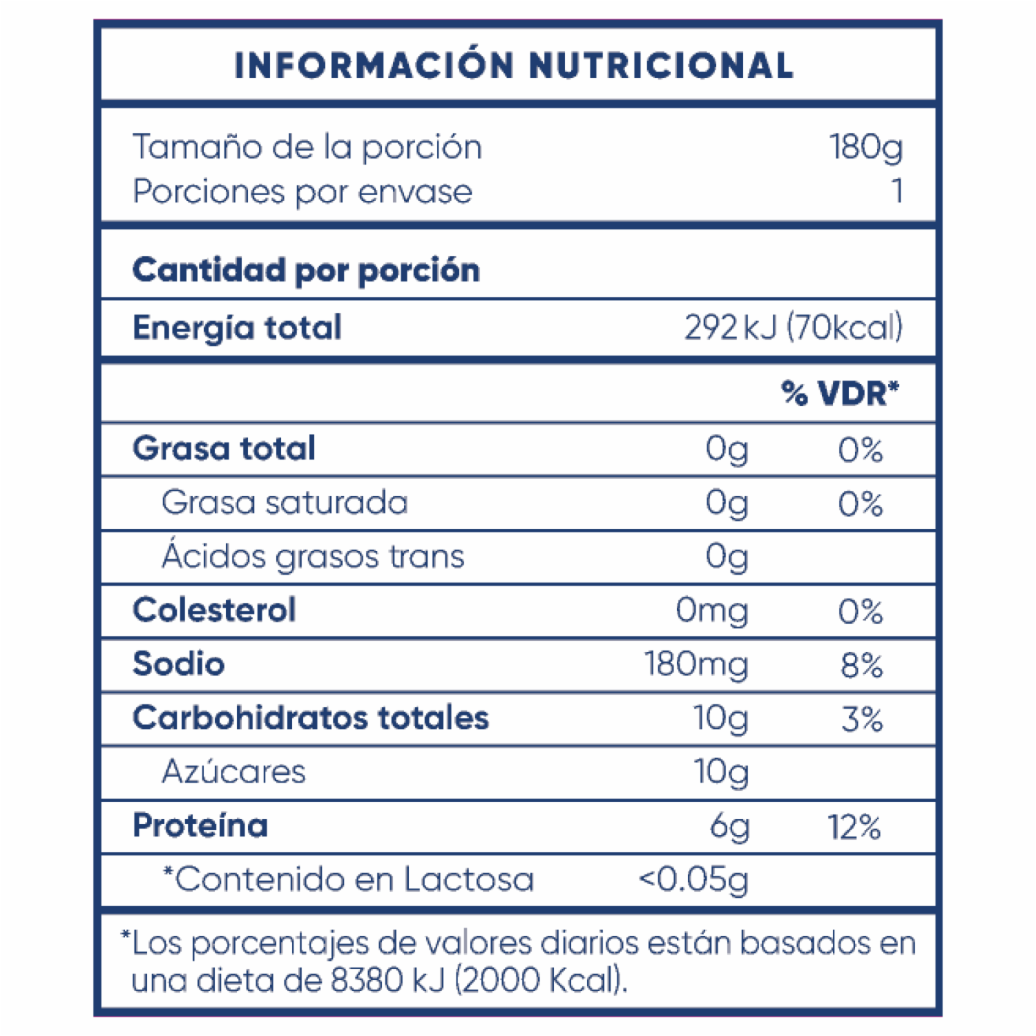 Yogur CHIVERIA sin lactosa, sin azúcar, 0% grasa, libre de colorantes y saborizantes artificiales. Elaborado con yogurt deslactosado descremado. Este producto contiene edulcorante no calórico