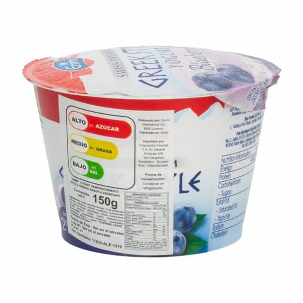 Yogurt semidescremado estilo griego sabor a arándanos, elaborado en Suiza, grasa 2% y proteína 8%