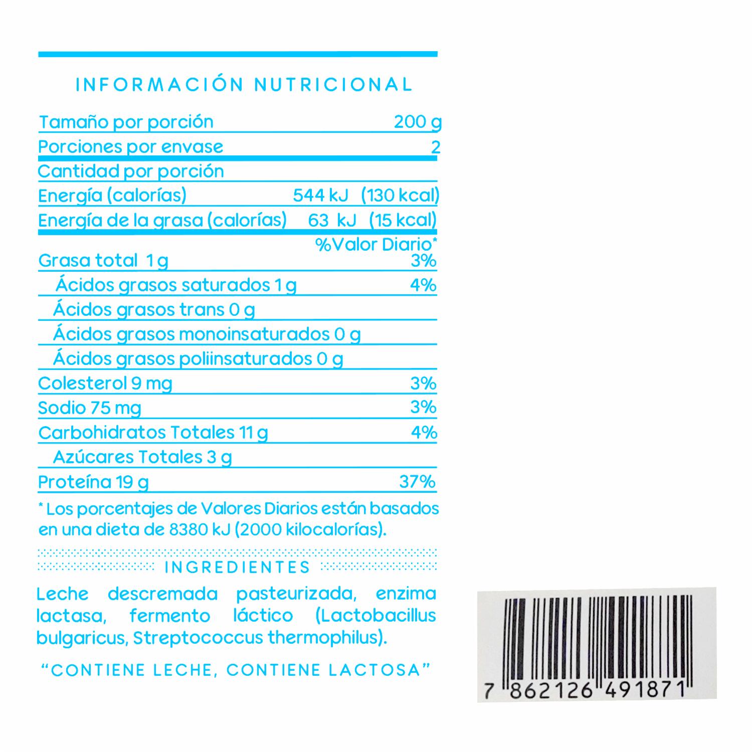 Yogurt natural griego triple cero: descremado, deslactosado y sin azúcar añadido. Una opción saludable y alta en proteína, ideal para quienes buscan cuidar su alimentación sin sacrificar el sabor ni la textura cremosa del yogurt griego