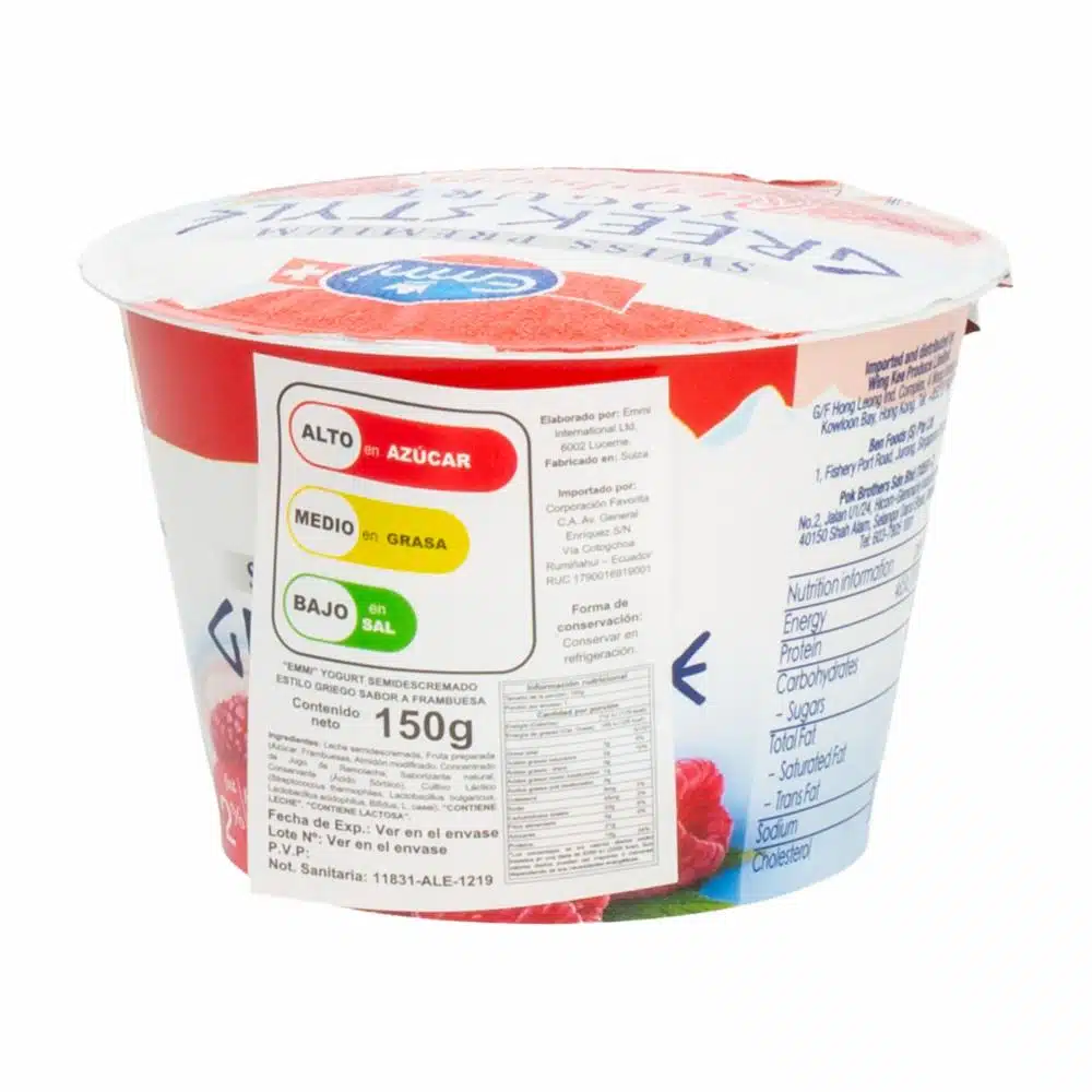 Yogurt semidescremado estilo griego sabor a frambuesa, elaborado en Suiza, grasa 2% y proteína 8%