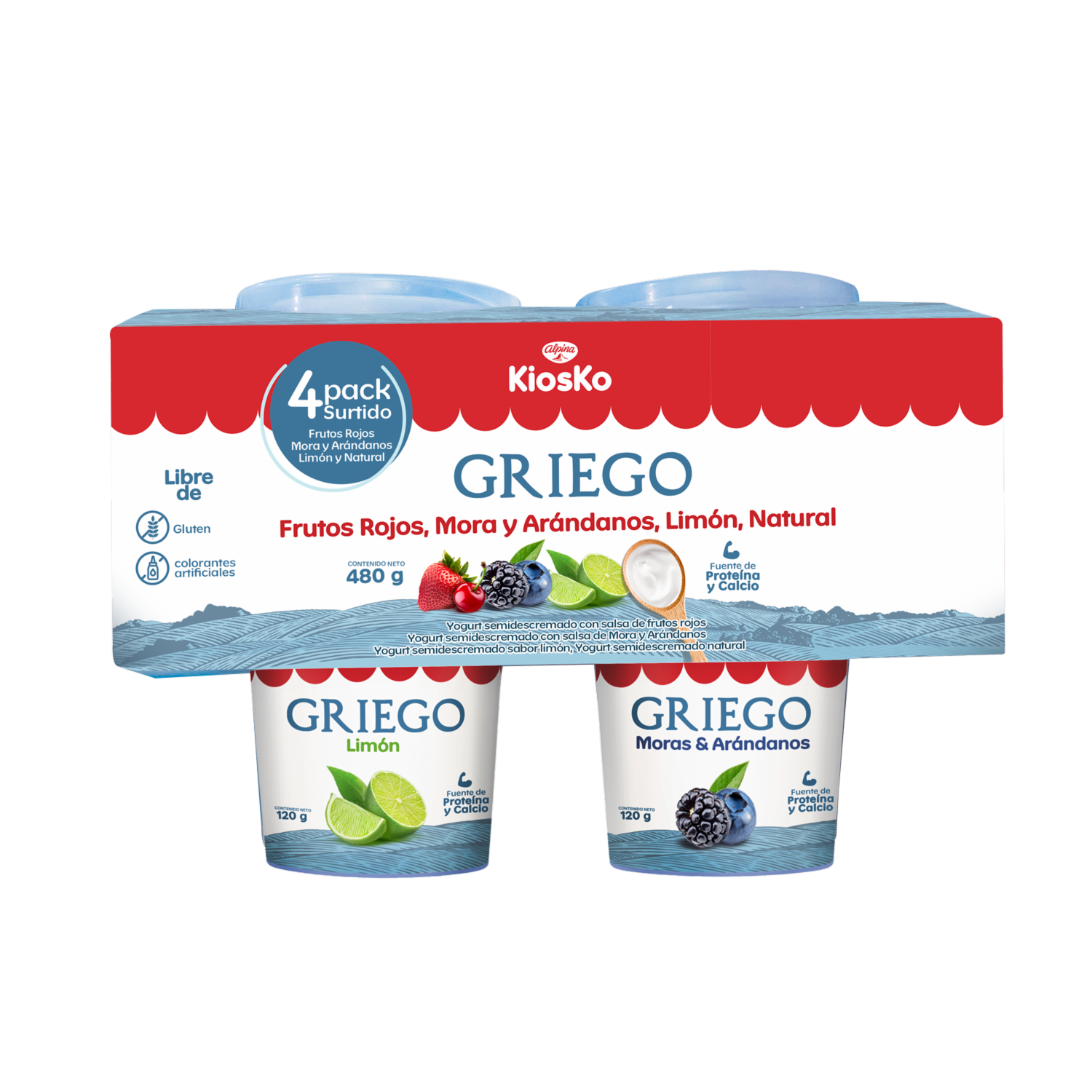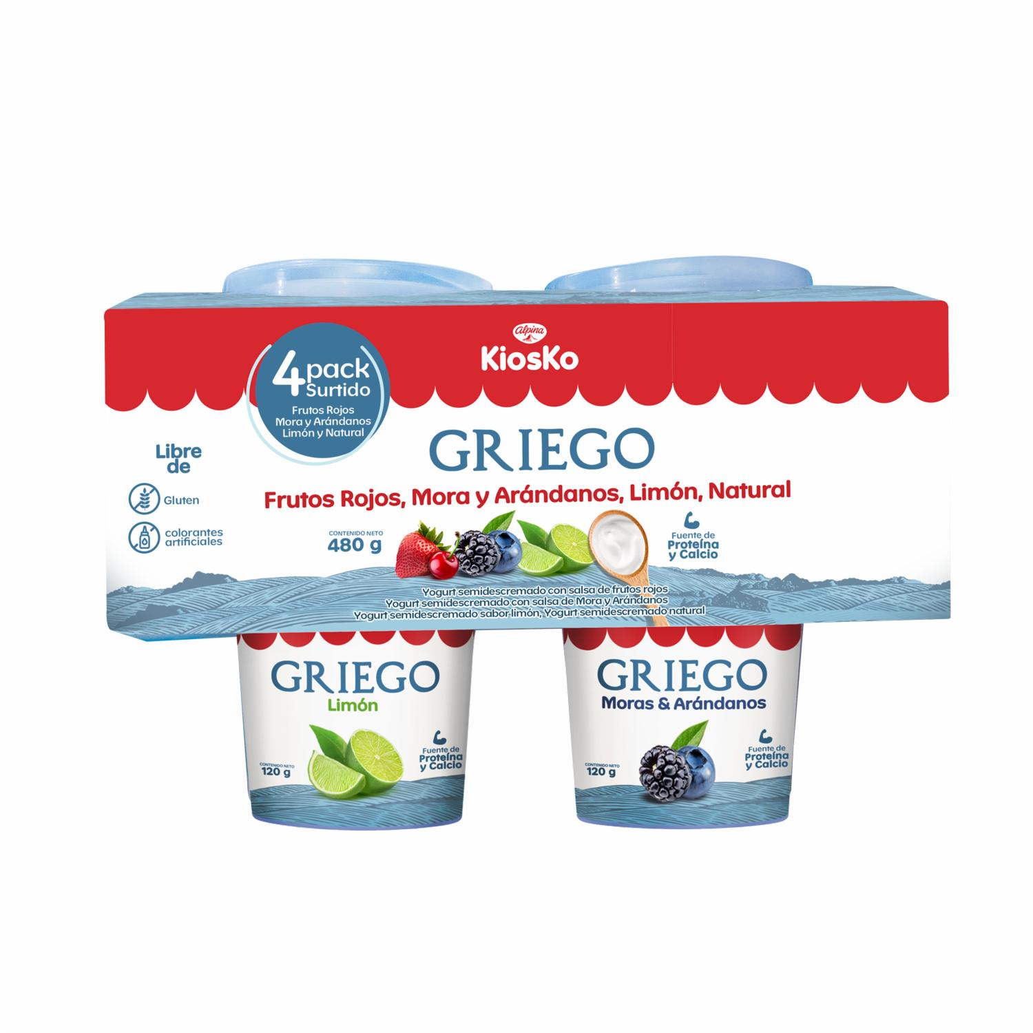 - Delicioso y saludable yogurt griego semidescremado. Libre de gluten y libre de colorantes artificiales. Fuente de proteína y calcio. Contiene 4 unidades de 120 gramos cada uno en 4 sabores: natural, limón, frutos rojos, mora y arándanos