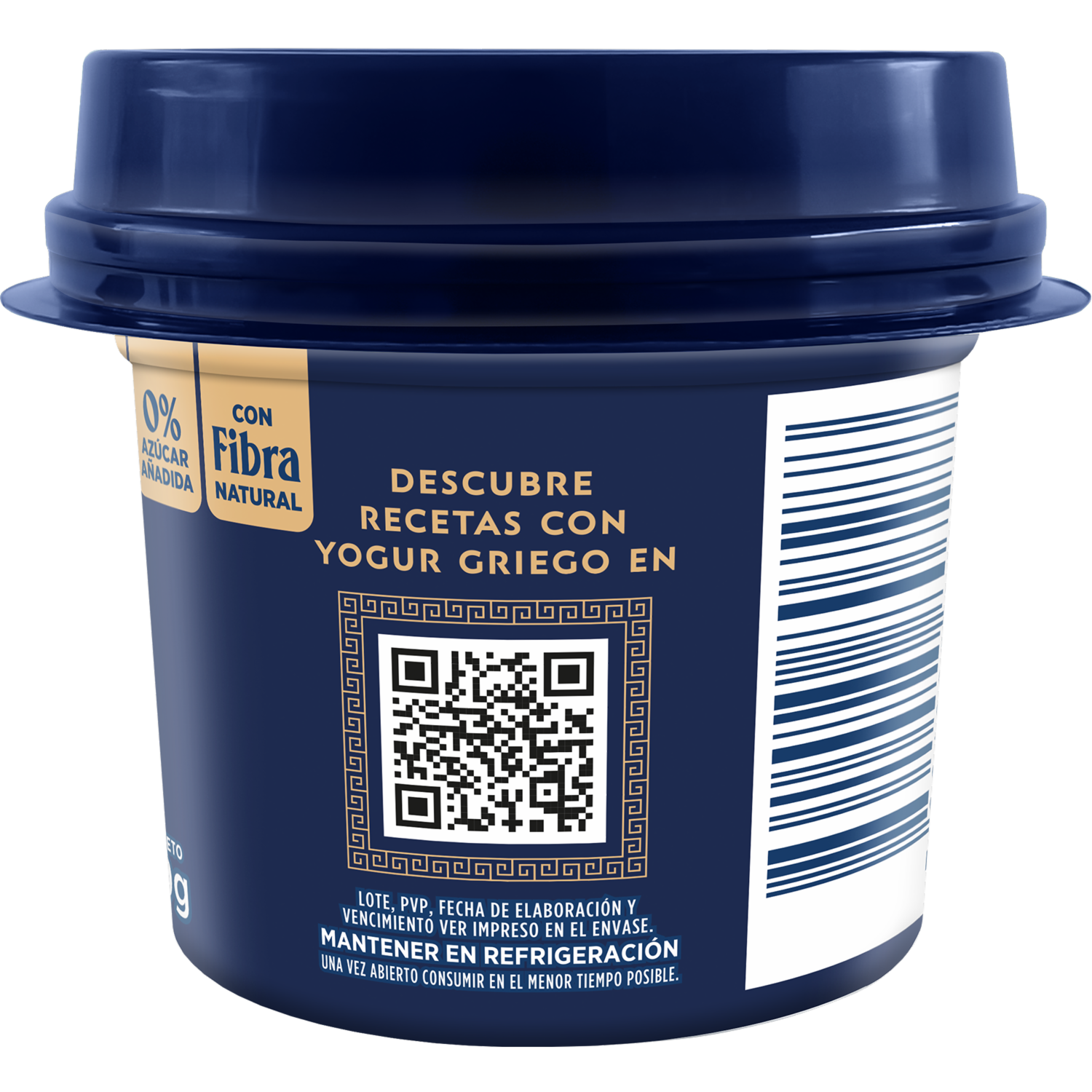 Con fibra natural, 0% Azúcar añadida, Alto en proteína, Cultivos de origen griego, Con probióticos Bifidus, Libre de colorantes y saborizantes artificiales