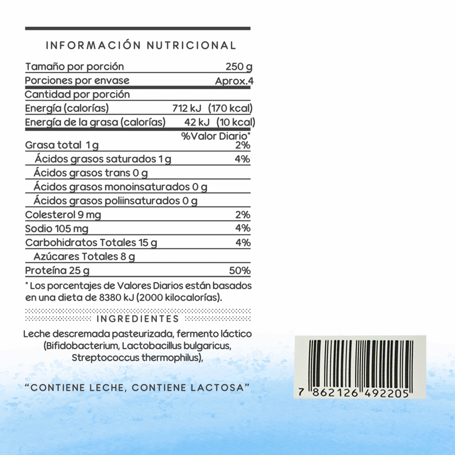 - Yogurt GRIEGO descremado 100 por ciento natural, ALTO en proteína, SIN azúcares ni endulzantes artificiales