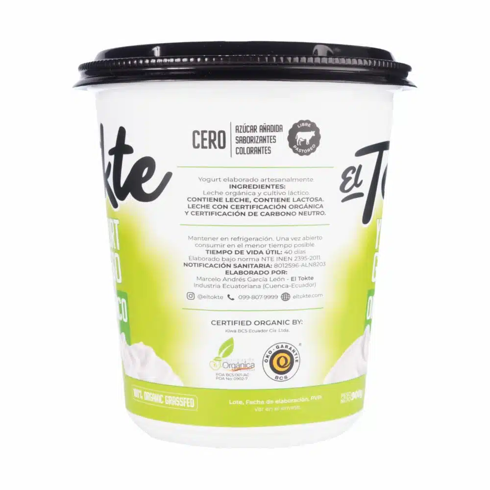 Yogurt elaborado artesanalmente. Ingredientes: leche orgánica y cultivo láctico. contiene leche, contiene lactosa. leche con certificación orgánica y certificación de carbono neutro