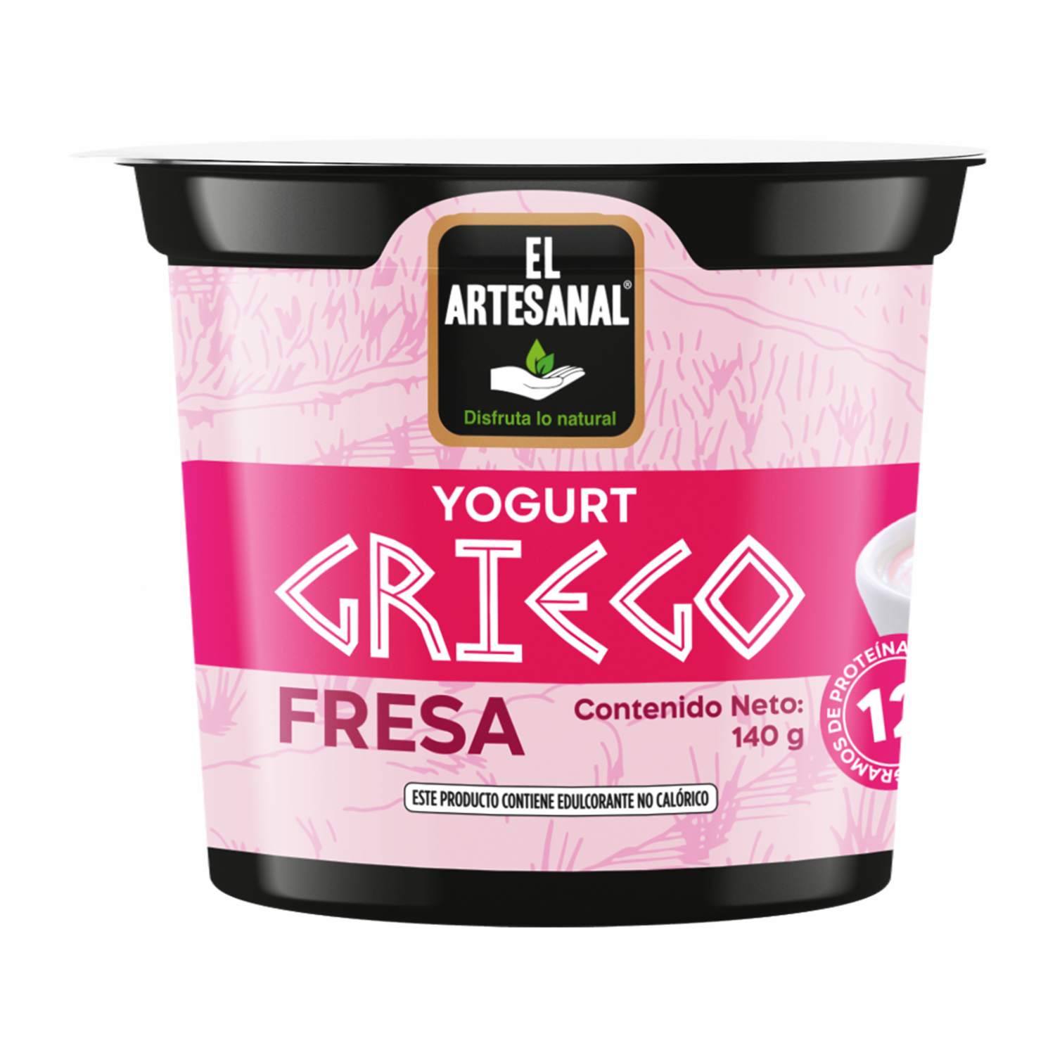 • El Yogurt Griego Fresa El Artesanal combina una textura cremosa y un sabor naturalmente delicioso, elaborado con leche fresca y trozos de fresa que le dan un toque irresistible. Aporta 12 gramos de proteína, además de calcio y probióticos que contribuyen a una buena digestión, fortalecen los huesos y te mantienen satisfecho por más tiempo