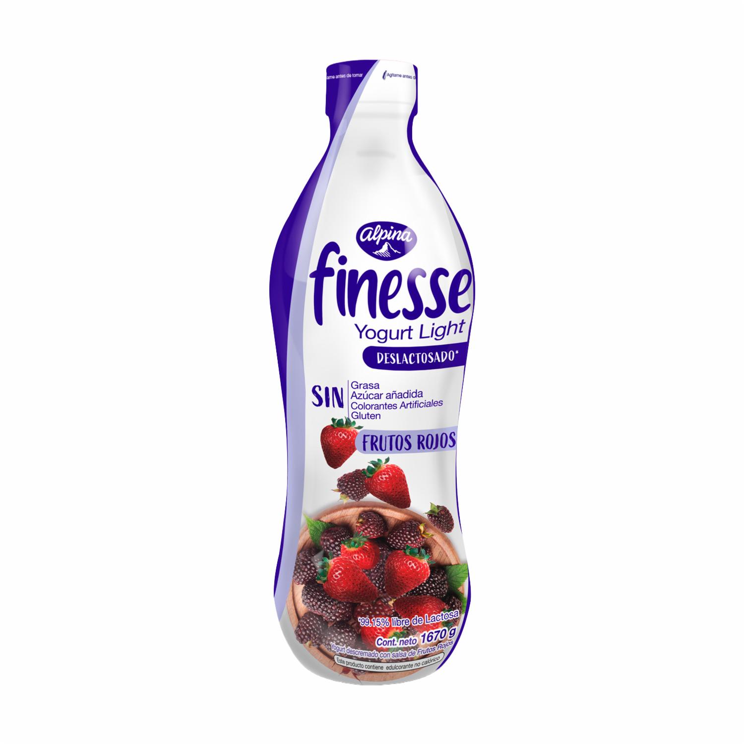 - Yogurt Finesse Deslactosado 1670g - Frutos Rojos, sin grasa ni azúcar añadida, ideal para desayuno o snack. Sin colorantes ni gluten, perfecto para intolerantes a la lactosa y quienes buscan naturalidad. Delicioso sabor a frutos rojos, formato ideal para compartir. Añádelo a tu carrito y cuida de tu salud