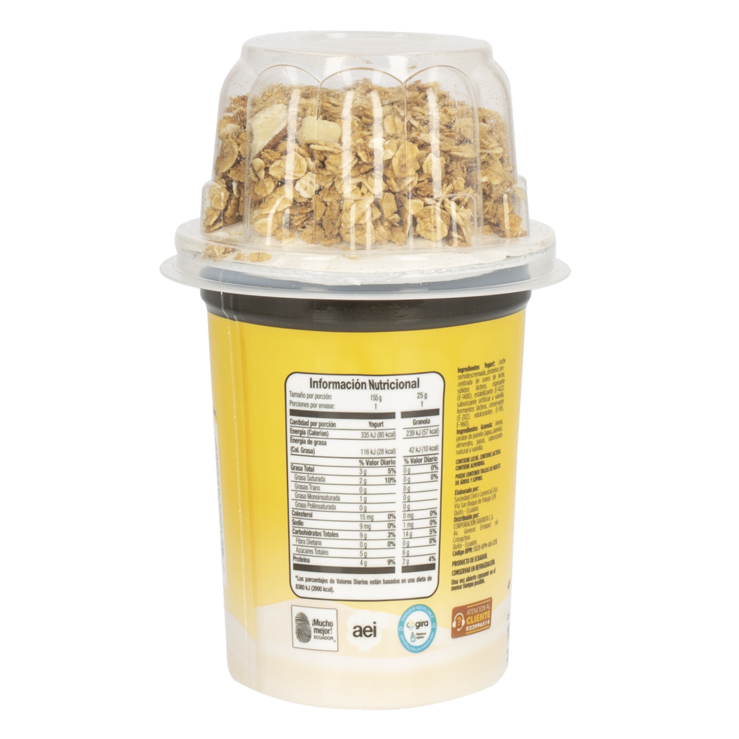 - Yogurt sabor vainilla con granola, una mezcla cremosa y deliciosa que combina el suave sabor de la vainilla con el toque crujiente de la granola. Perfecto para disfrutar como desayuno rápido, merienda nutritiva o snack en cualquier momento del día