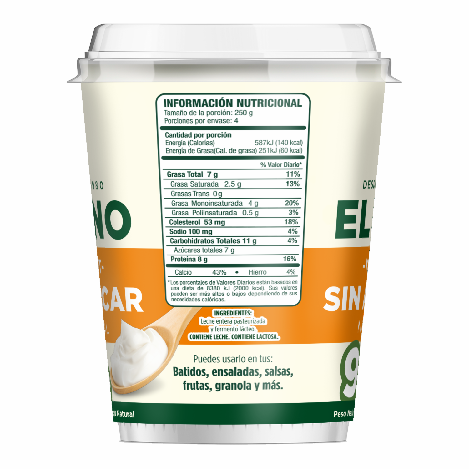 Es un producto lácteo que se obtiene mediante la fermentación de la leche con bacterias beneficiosas como Lactobacillus bulgaricus y Streptococcus thermophilus.Su textura es cremosa, y es una excelente fuente de proteínas, calcio, y probióticos, que favorecen la salud digestiva. Es ideal para quienes buscan una opción nutritiva y baja en carbohidratos, y puede ser consumido solo o combinado con frutas, semillas o granola para darle un toque personalizado