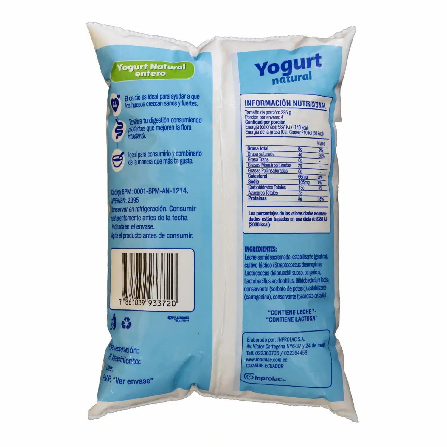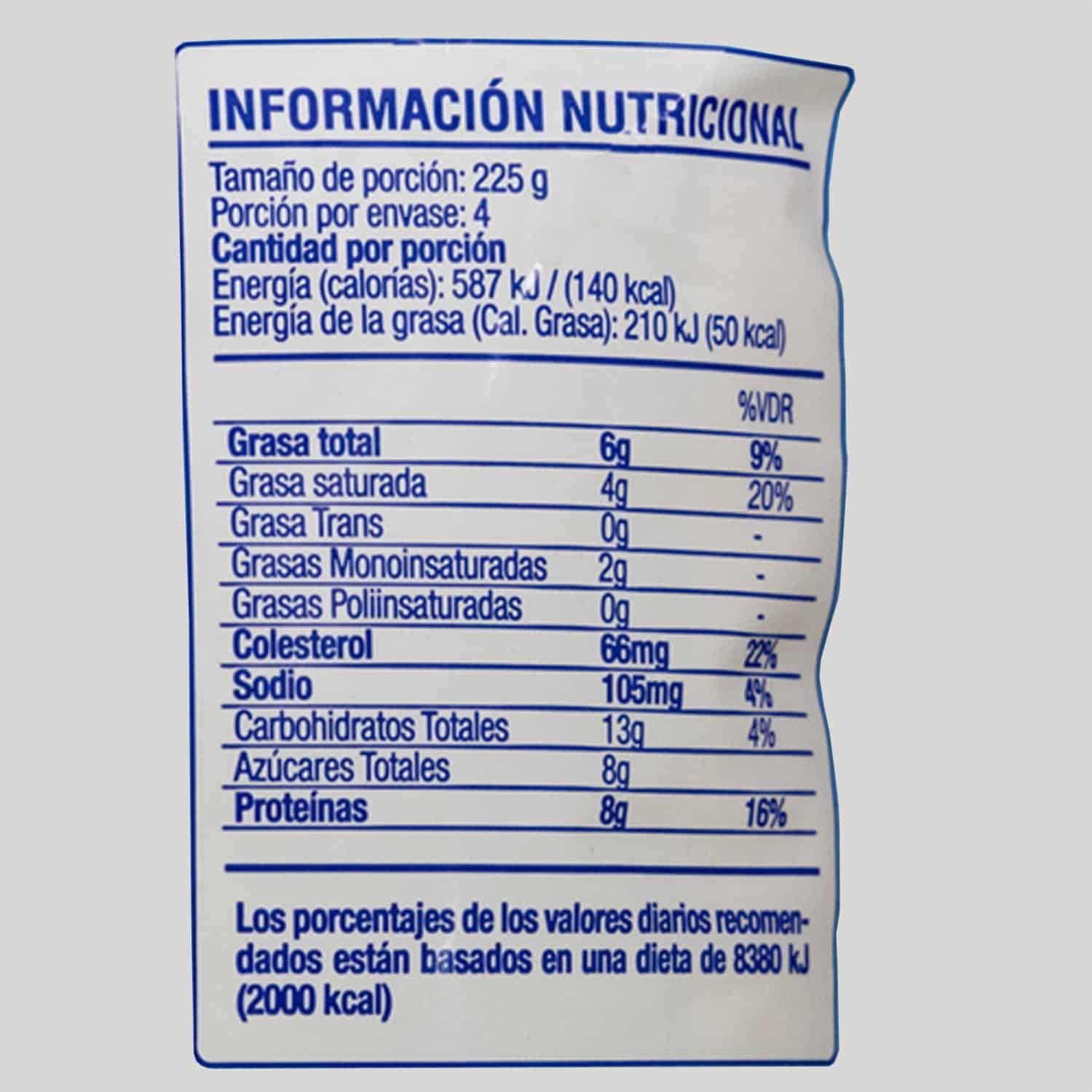 Contiene leche, contiene lactosa, contiene probióticos, sin colorantes, sin saborizantes artificiales. Conservar en refrigeración. Consumir preferentemente antes de la fecha indicada en el envase. Agite el producto antes de consumir