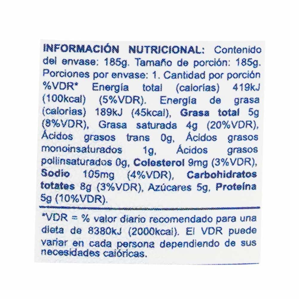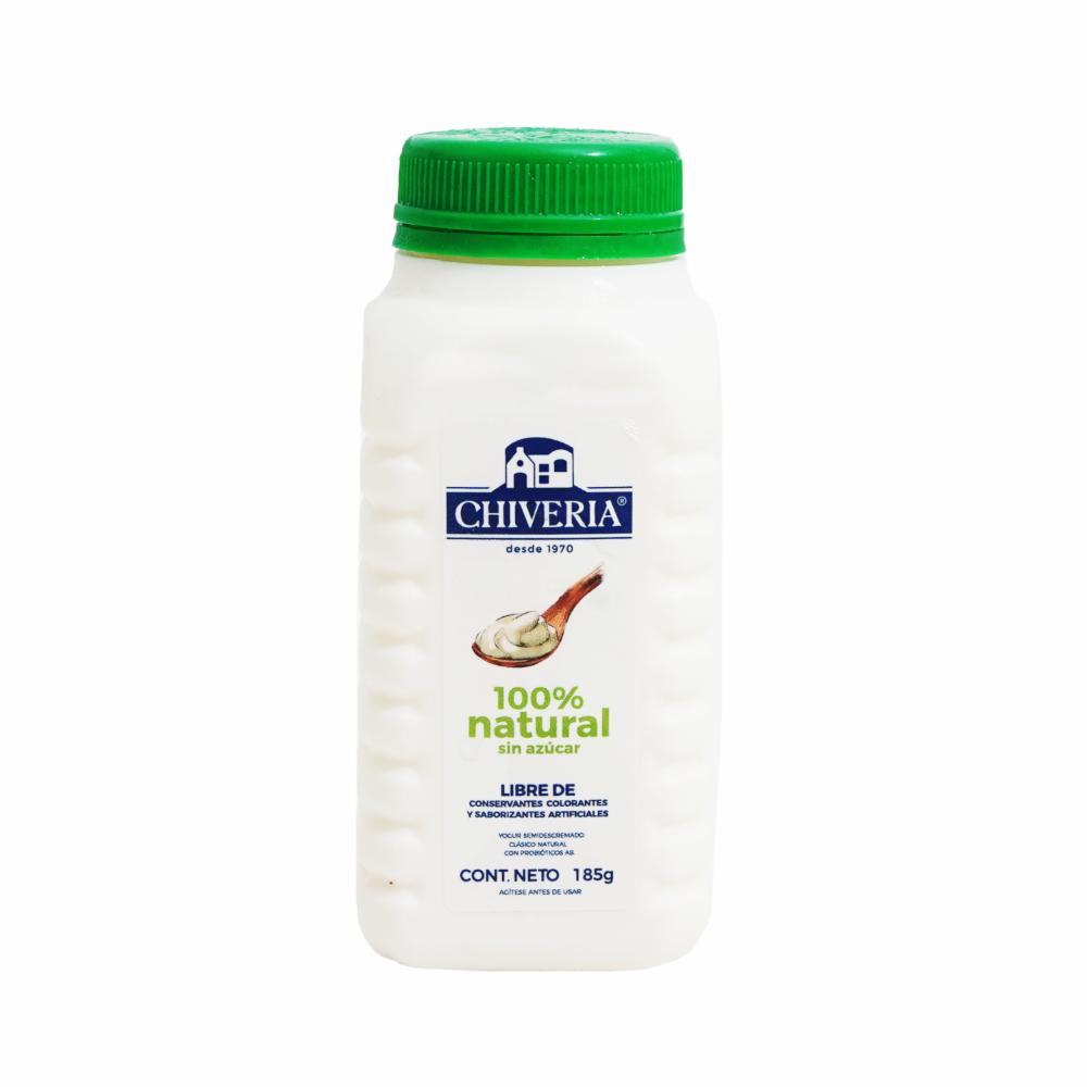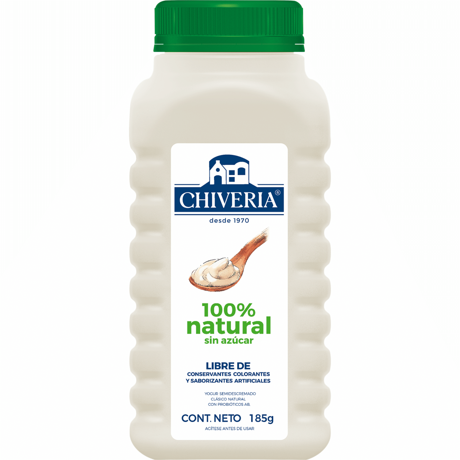 Yogur 100% natural CHIVERIA, sin azúcar, libre de conservantes, colorantes y saborizantes artificiales. Elaborado con yogurt clásico natural semidescremado con probióticos AB. Este producto contiene edulcorante no calórico