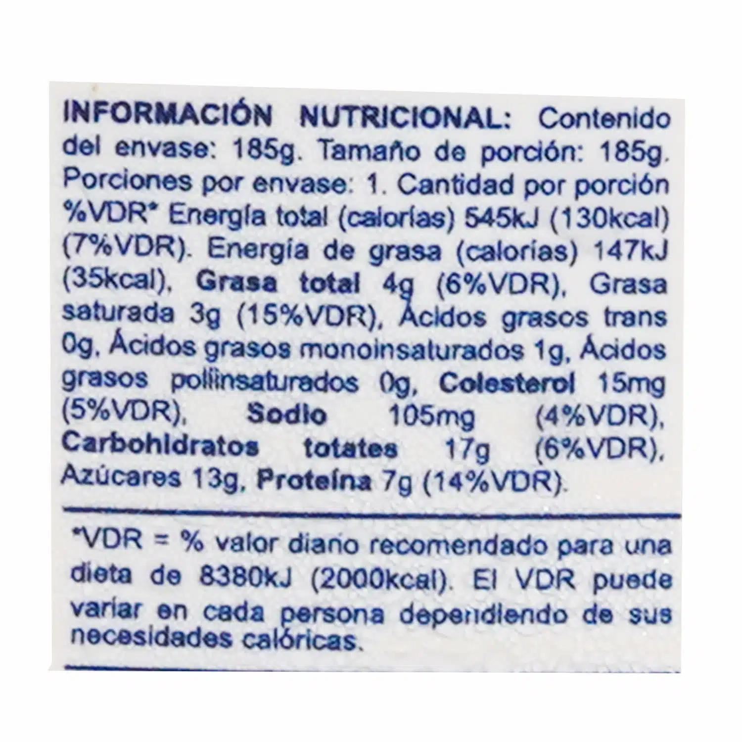 Yogur CHIVERIA sin azúcar, libre de colorantes y saborizantes artificiales. Elaborado con yogurt semidescremado clásico con probióticos AB. Este producto contiene edulcorante no calórico