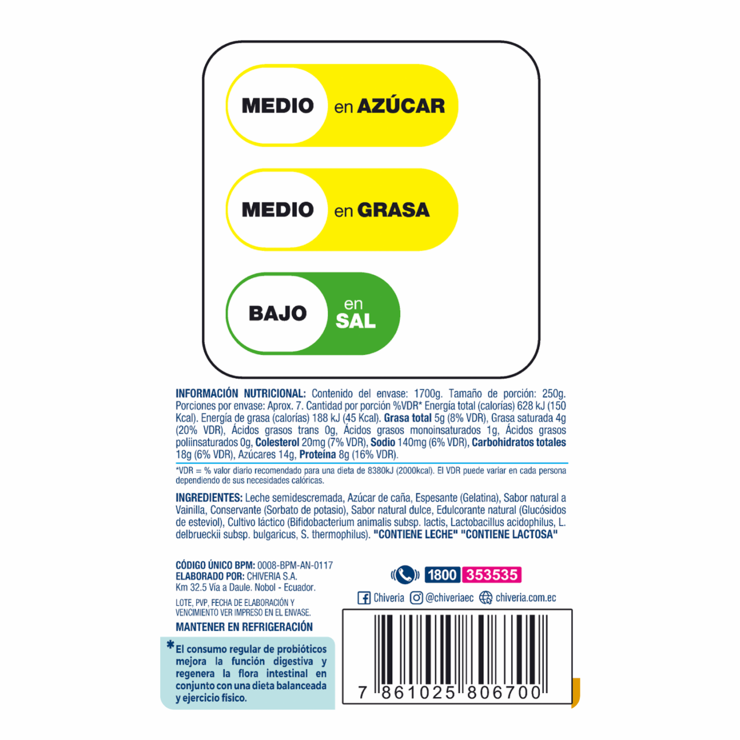 - Yogur CHIVERIA sin azúcar, libre de colorantes y saborizantes artificiales. Elaborado con yogurt semidescremado clásico con probióticos AB. Este producto contiene edulcorante no calórico