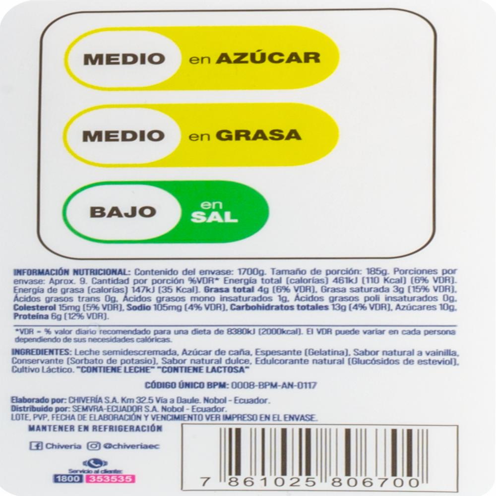 Yogurt Semidescremado Con Sabor A Vainilla CHIVERIA 1700 G