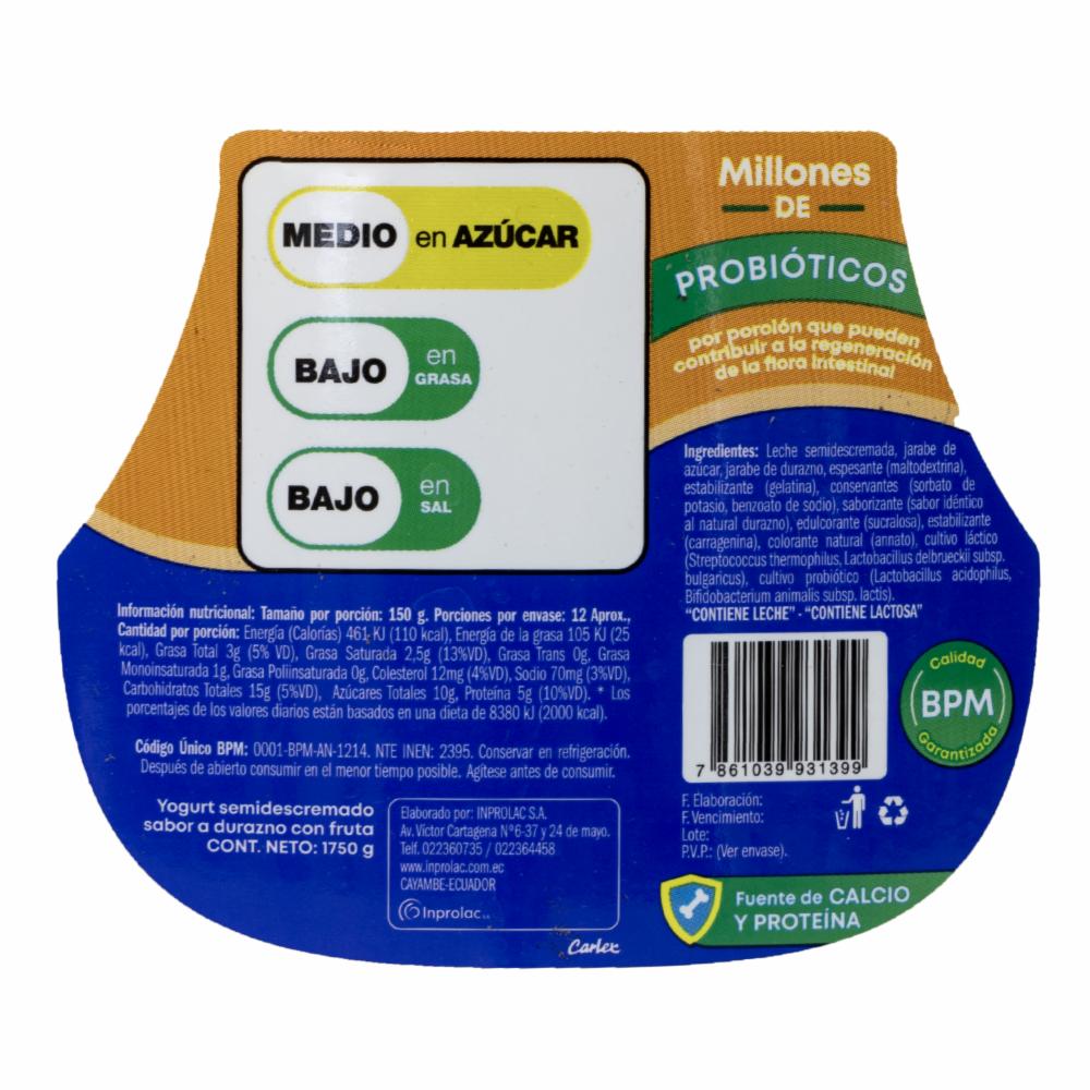 Yogurt Semidescremado Sabor A Durazno Con Fruta DULACS 1750 G