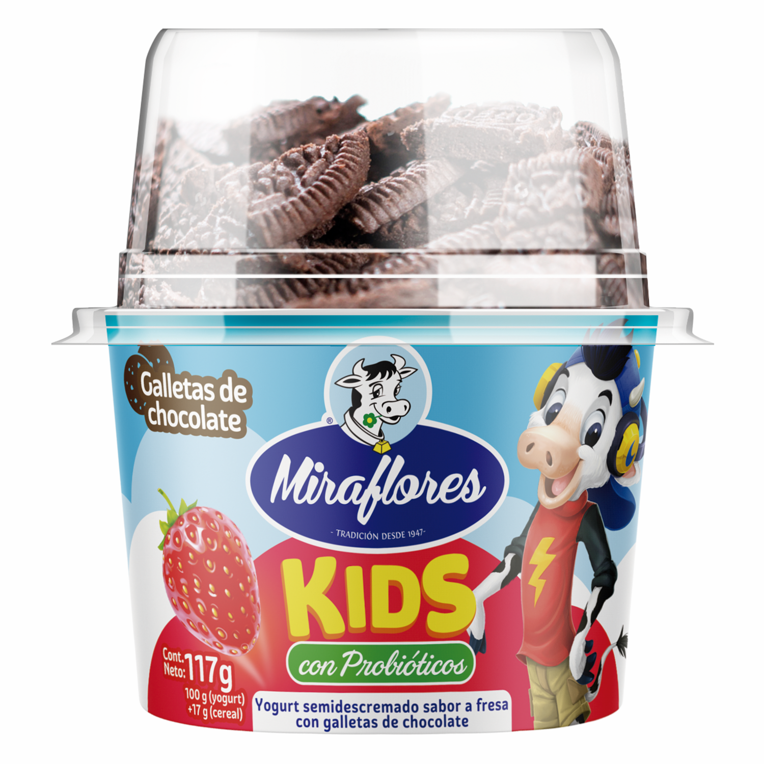 - Yogurt semidescremado con sabor a fresa acompañado de galleta de chocolate para una explosión de sabor. Ideal para loncheras y snacks