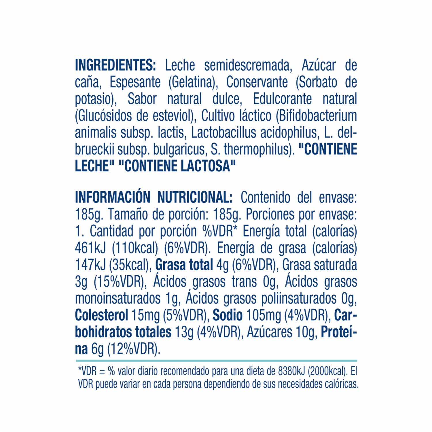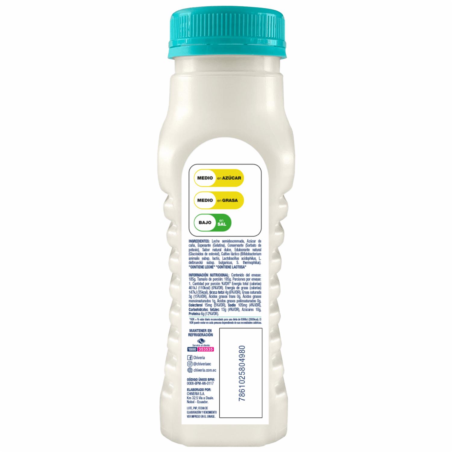 - Yogur CHIVERIA sin azúcar, libre de colorantes y saborizantes artificiales. Elaborado con yogurt semidescremado clásico con probióticos AB. Este producto contiene edulcorante no calórico