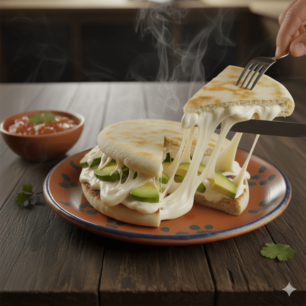 El bocado venezolano o colombiano que te salva el día. Una arepa de maíz dorada y crujiente, rellena de queso fresco derretido y aguacate cremoso. Un plato potente para cualquier hora.