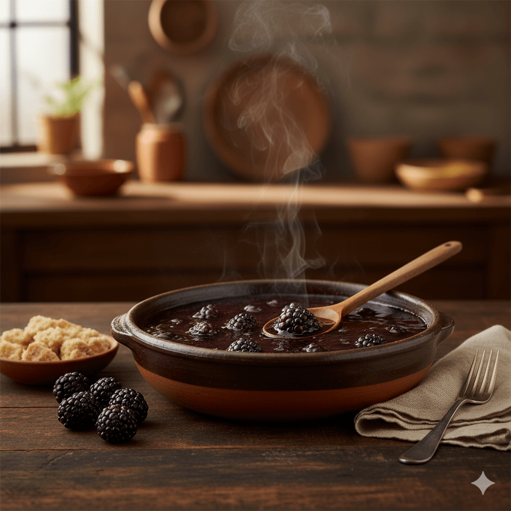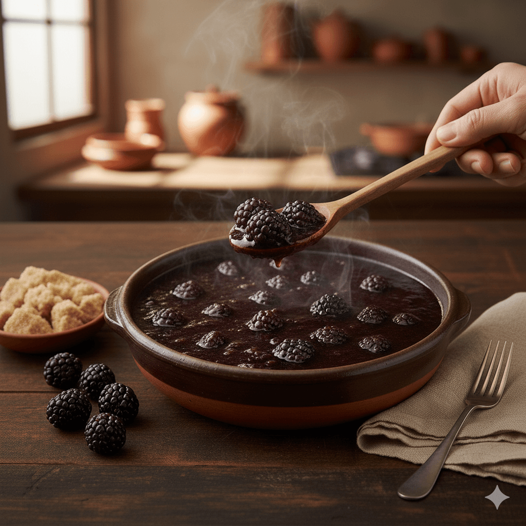 Un dulce tradicional espeso y concentrado. Las moras se cocinan lentamente con azúcar hasta obtener un jarabe denso y dulce, perfecto para acompañar queso fresco o postres.