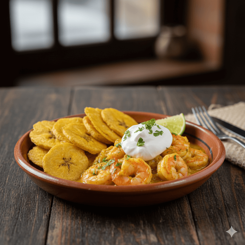 Camarones salteados en una cremosa salsa agria, llenos de sabor, acompañados de patacones dorados y crujientes. Una receta fácil que provoca desde el primer bocado.