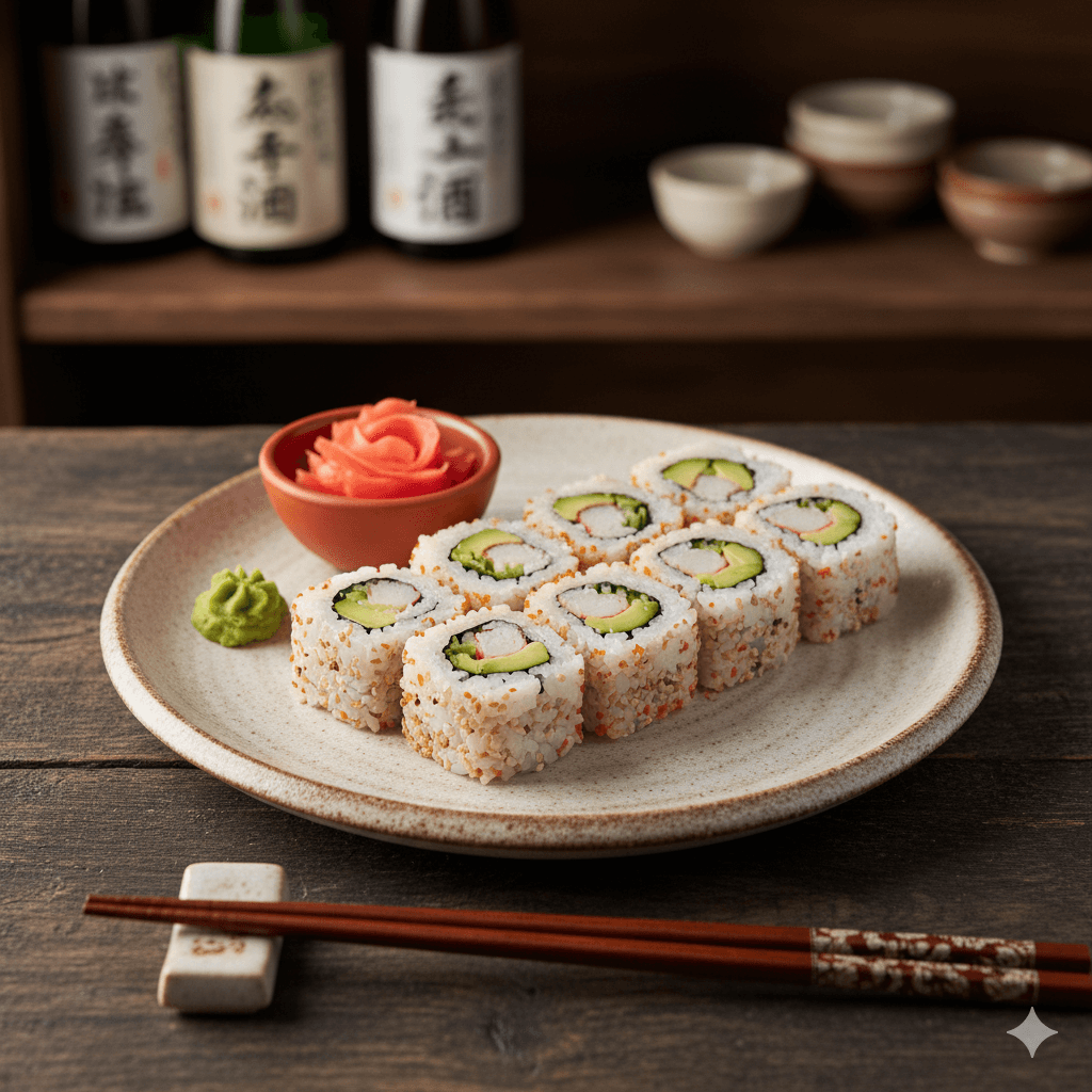 El sushi más popular, fácil y accesible. Arroz envuelto con alga nori y relleno de palitos de cangrejo, aguacate y pepino. Un bocado fresco y ligero, perfecto para iniciarte en el mundo del sushi.