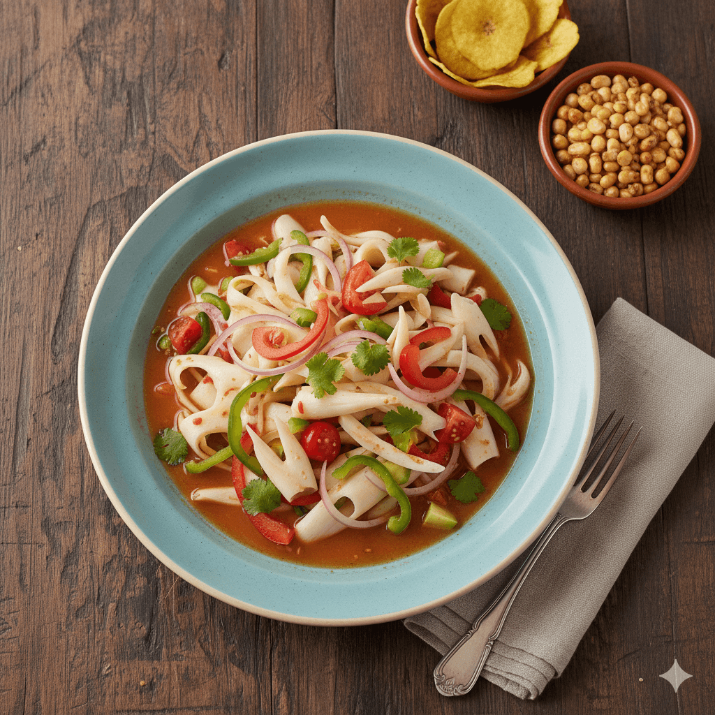 El sabor del ceviche sin mariscos. El corazón tierno y fresco del palmito se marina en un jugo cítrico vibrante con cebolla, cilantro y tomate. Es la opción vegana y refrescante perfecta para cualquier ocasión.