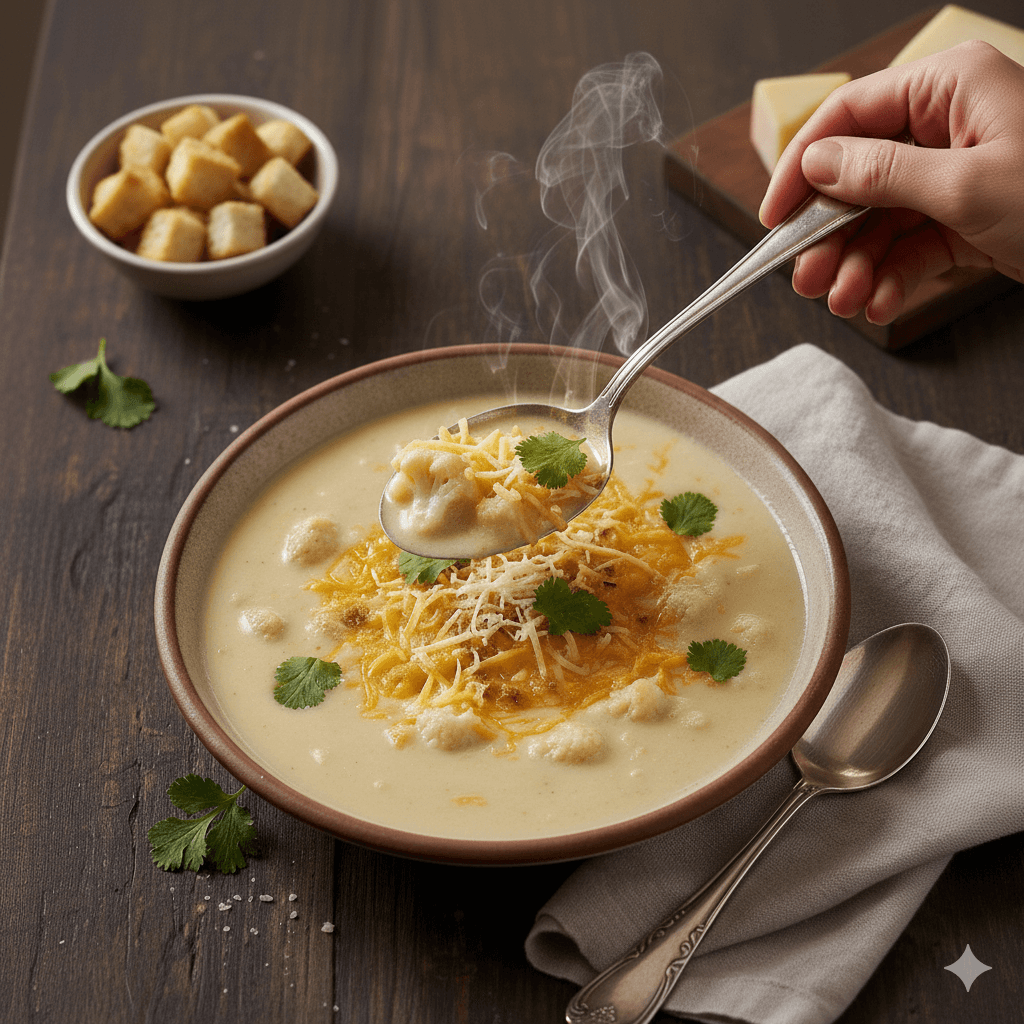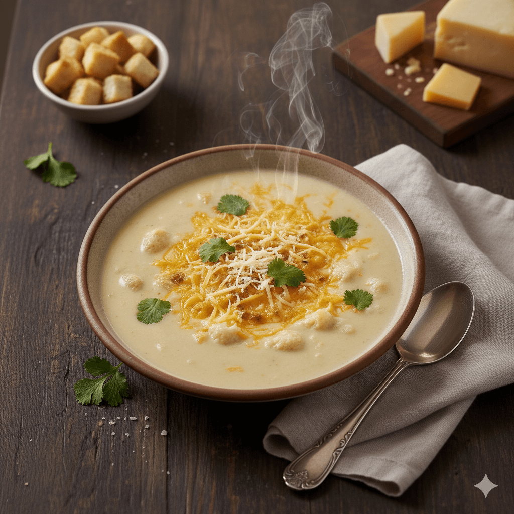Una sopa elegante, cremosa y con pocos carbohidratos. La coliflor se cuece y licúa hasta obtener una base suave, enriquecida con queso derretido que le da un toque gourmet. Ideal para una entrada nutritiva.