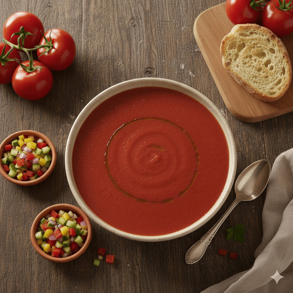 La sopa fría y refrescante de España. Tomates, pimientos, pepino y ajo se licúan para crear un plato líquido, vibrante y perfecto para el verano. La definición de frescura.