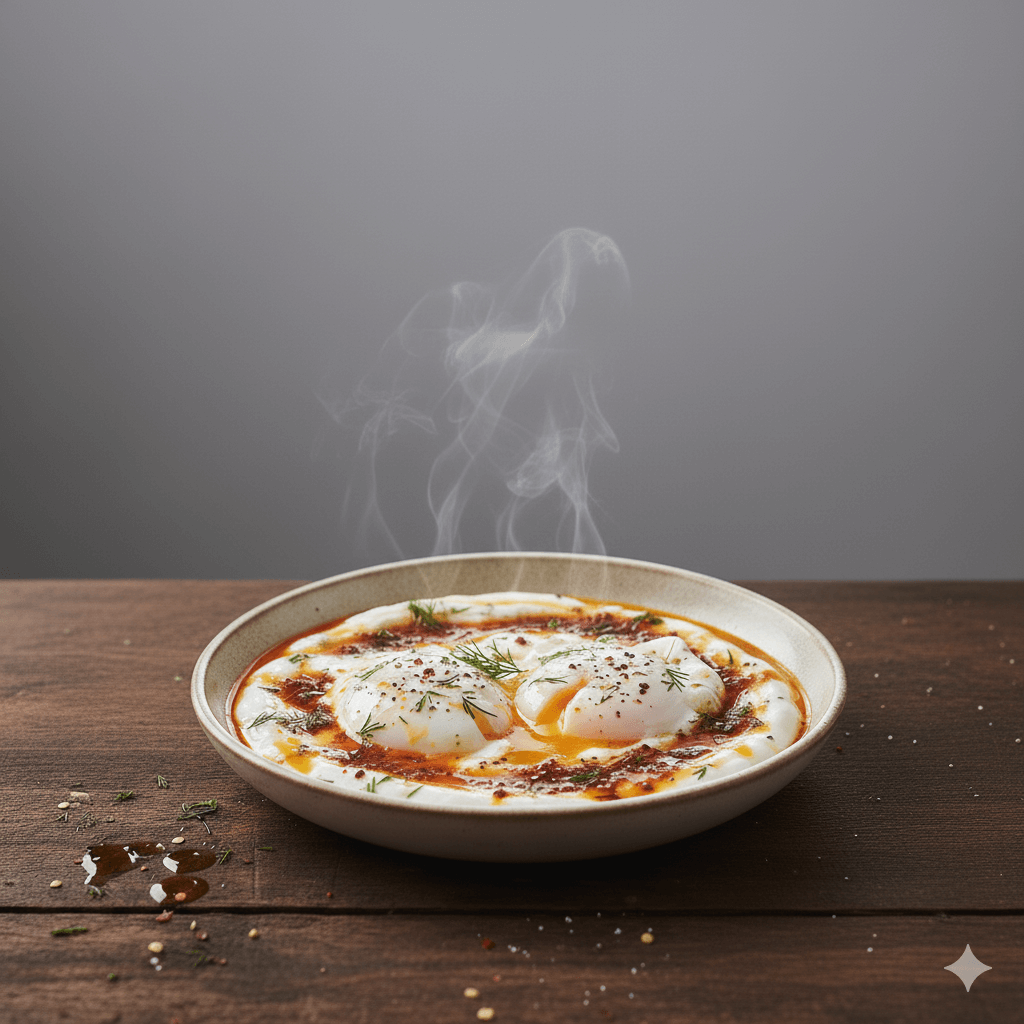 Un desayuno exótico y lleno de sabor. Huevos poché servidos sobre un cremoso yogur de ajo, bañados en una mantequilla caliente con paprika. Una explosión de sabores y texturas.