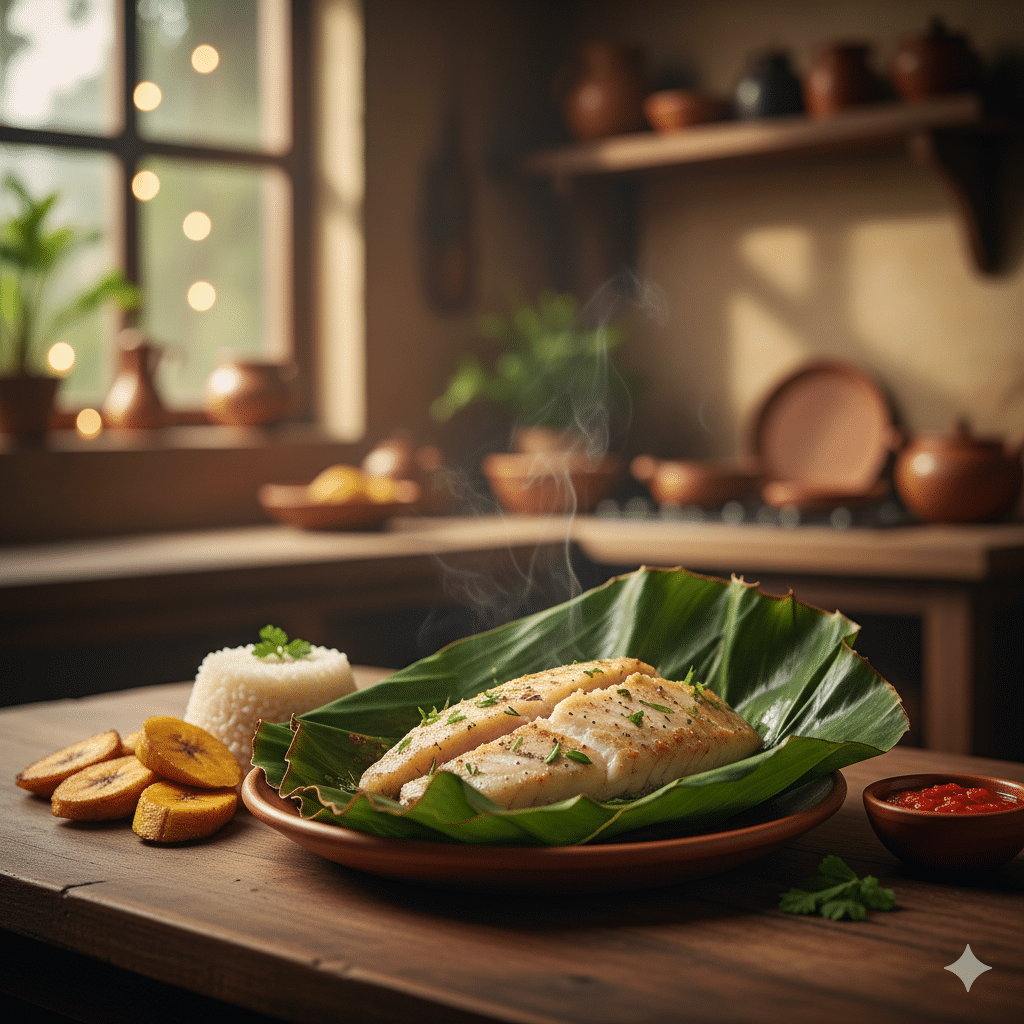 Una experiencia culinaria ancestral. Pescado de río fresco cocinado al vapor dentro de una hoja de bijao, que le transfiere un aroma herbal y un sabor único. Sabor ahumado y natural directo de la selva.